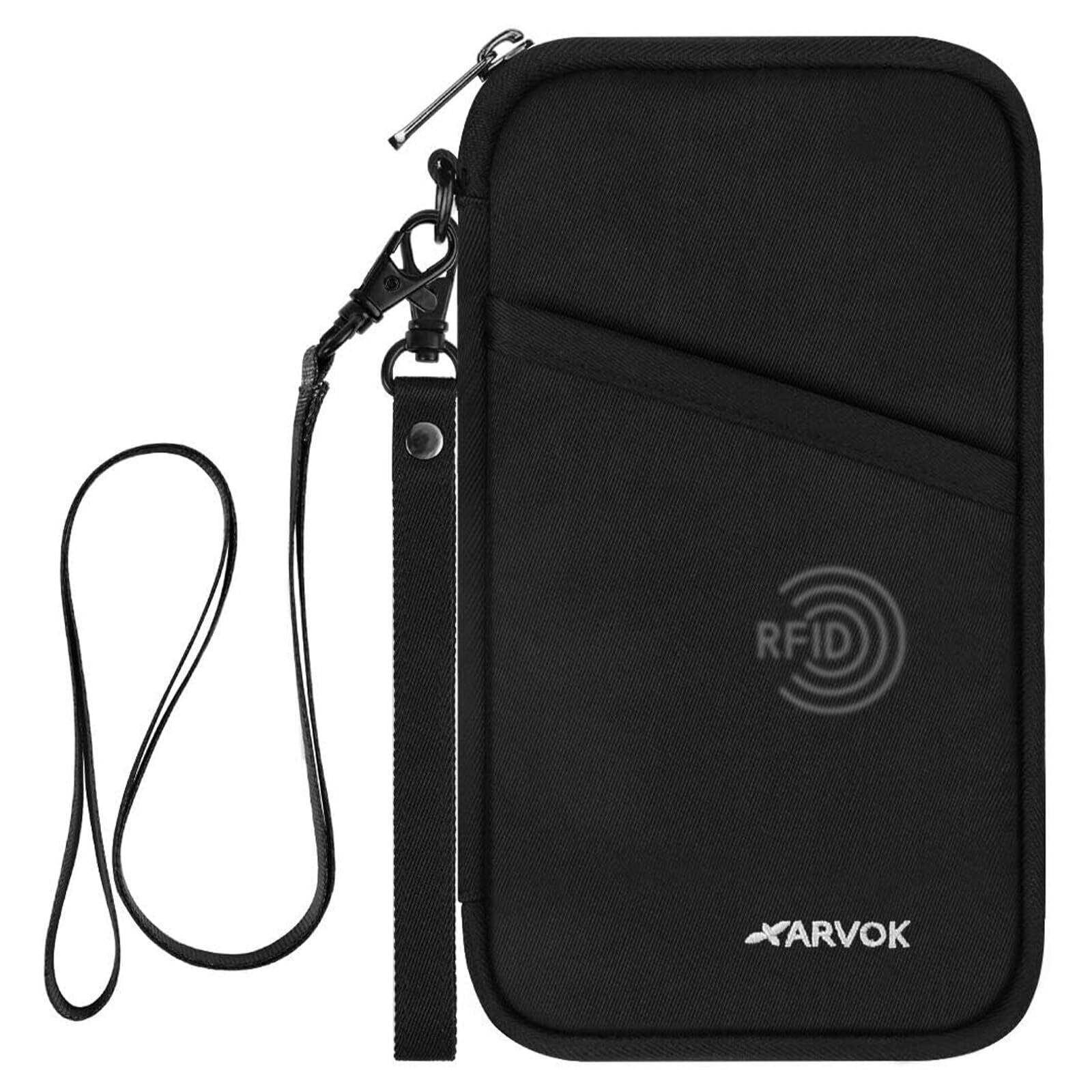 [ARVOK] パスポートケース 首下げ 2Way RFID スキミング防止 セキュリティポーチ パスポートカバー 超薄型 軽量140gx13ポケット 大容量 多機能 コンパクト カンバス 便利グッズ 海外旅行 撥水 首掛けストラップ&ハンズストラップ パスポートバッグ男女兼用 海外旅行バッグ 防犯 トラベルポーチ(マットブラック)