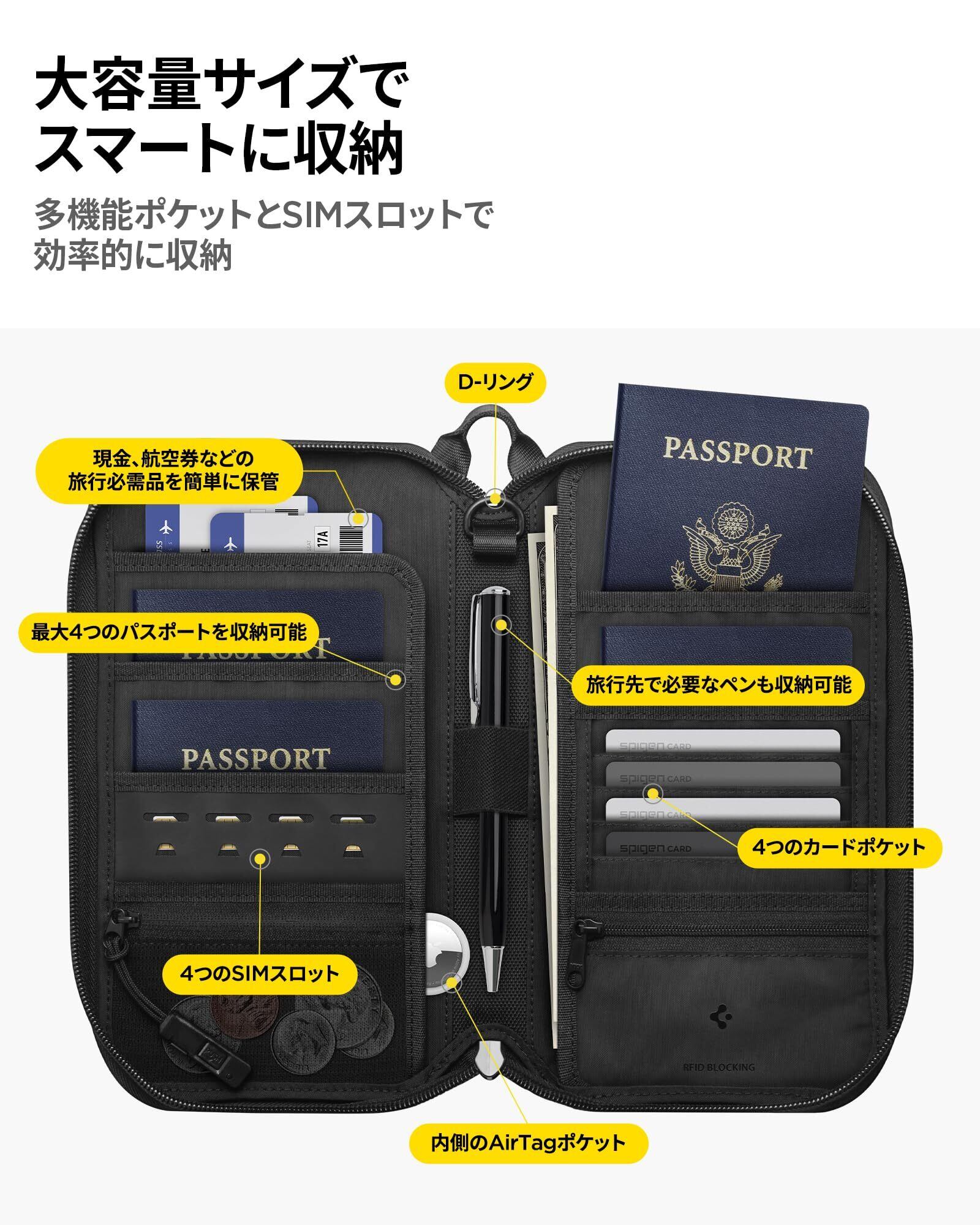[Spigen] パスポートケース トラベルポーチ【大容量収納/コンパクト】 ガジェットポーチ スキミング防止 セキュリティ KD500 AFA07574(ブラック)