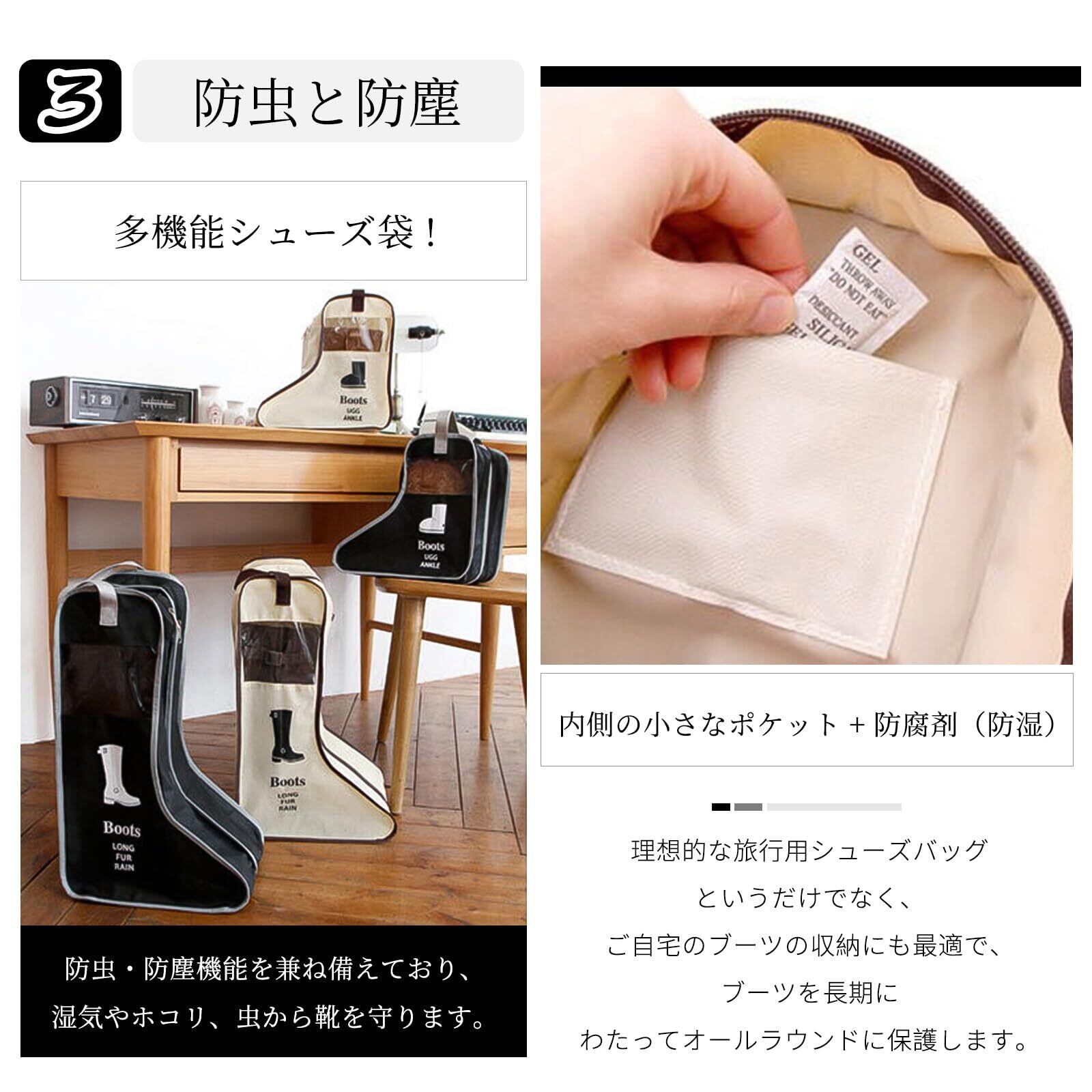 防虫と防塵:多機能シューズ袋は、防虫・防塵機能を兼ね備えており、湿気やホコリ、虫から靴を守ります。理想的な旅行用シューズバッグというだけでなく、ご自宅のブーツの収納にも最適で、ブーツを長期にわたってオールラウンドに保護します。