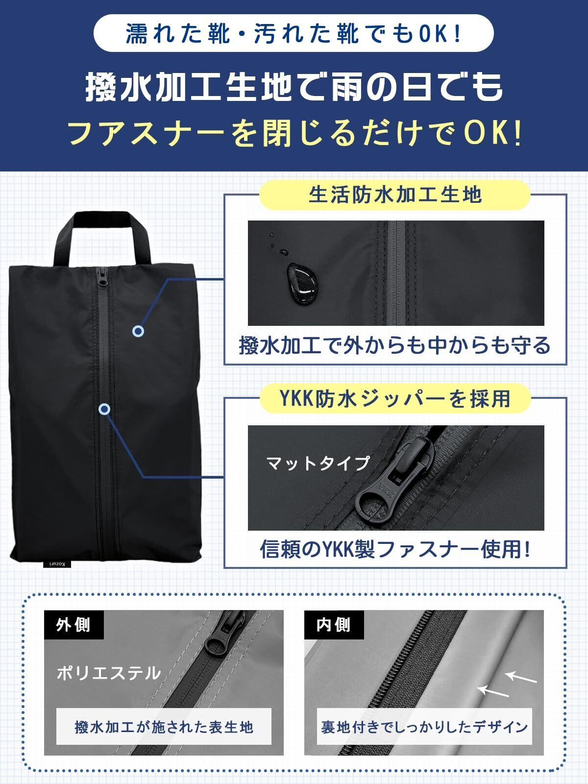【プロ級撥水&防塵性能】濡れた靴・砂付き靴もそのまま収納可能。ポリエステル素材で衛生管理を保ちながら外部の塵をブロック。【軽量&大容量収納】最大Lサイズ(40×24cm)でブーツやバッシュも収納可能。旅行やスポーツで複数のアイテムをまとめて持ち運べます。
