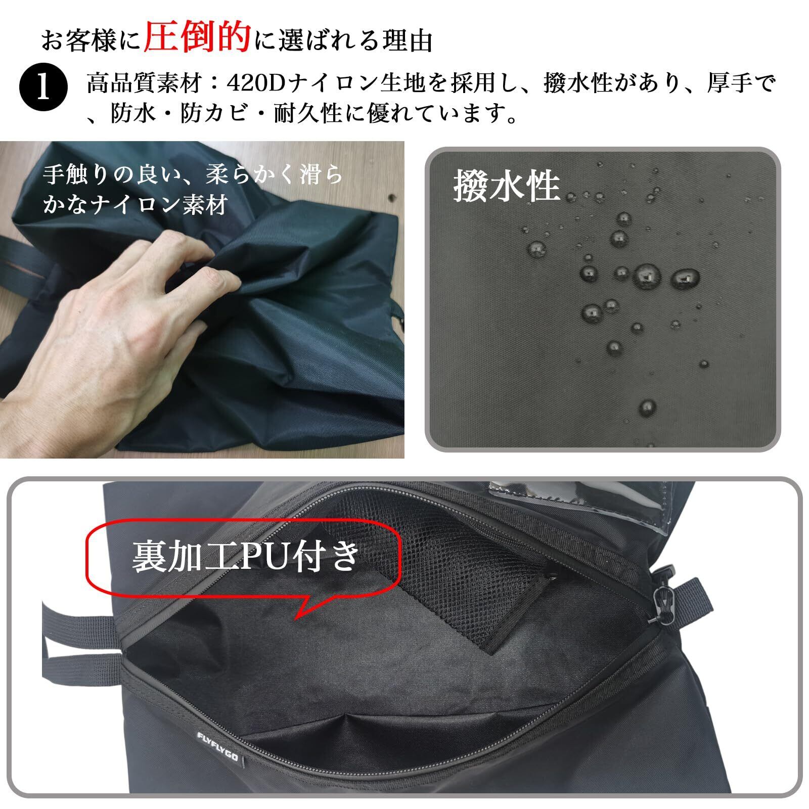 【420D高品質ポリエステル素材(裏加工PU)】高品質な420Dポリエステル生地(裏加工PU)を採用し、防汚性・防水性に優れ、水洗いも可能で常に清潔に保てます。耐久性と柔軟性を兼ね備え、自宅でも外出先でも便利にお使いいただけます。防水ジッパーを使用しており、防水性を高めると同時に、靴の臭い漏れを防止します。