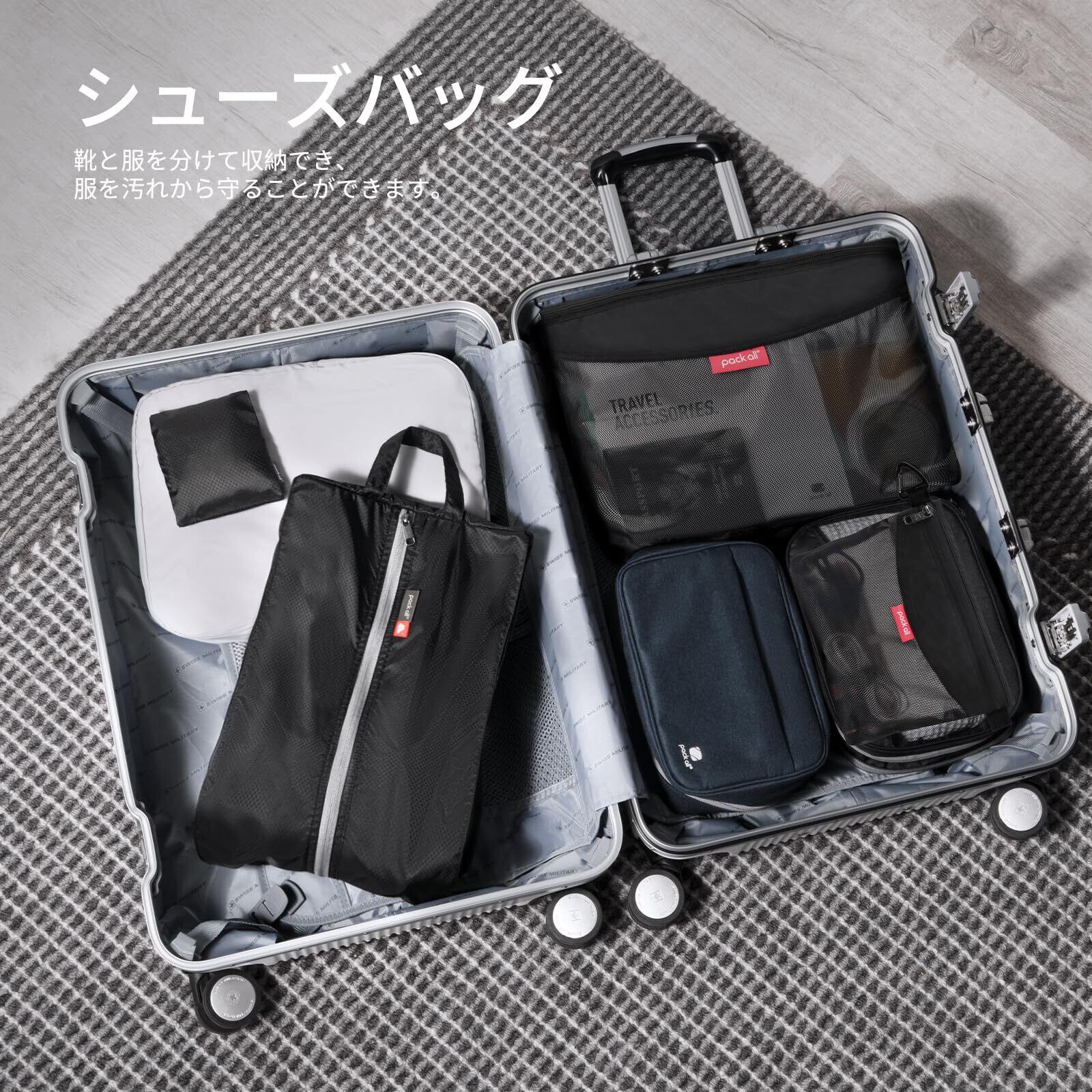 pack all 折りたたみ式シューズケース 二重ポケット構造 ファスナー付きの防水トラベルシューズバッグ 軽量 撥水加工のナイロン素材 お手入れが簡単 上履き入れ 靴入れ 衣類収納 収納バッグ 旅行 出張 スポーツ 外出 学校 家庭用 通常版(ブラック)