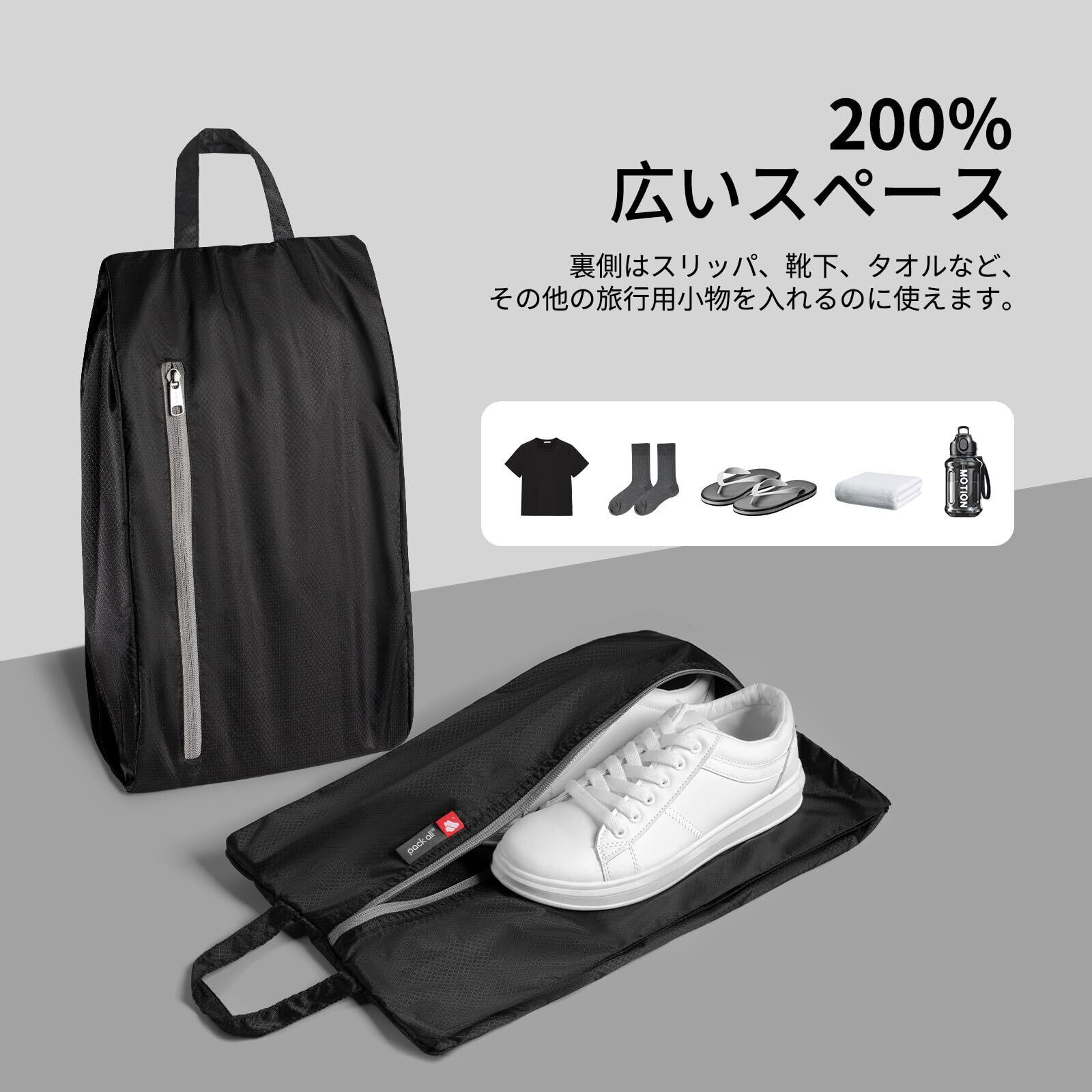 \二重ポケット構造・防水性能!/[pack all 折りたたみ式シューズケース (ブラック)]