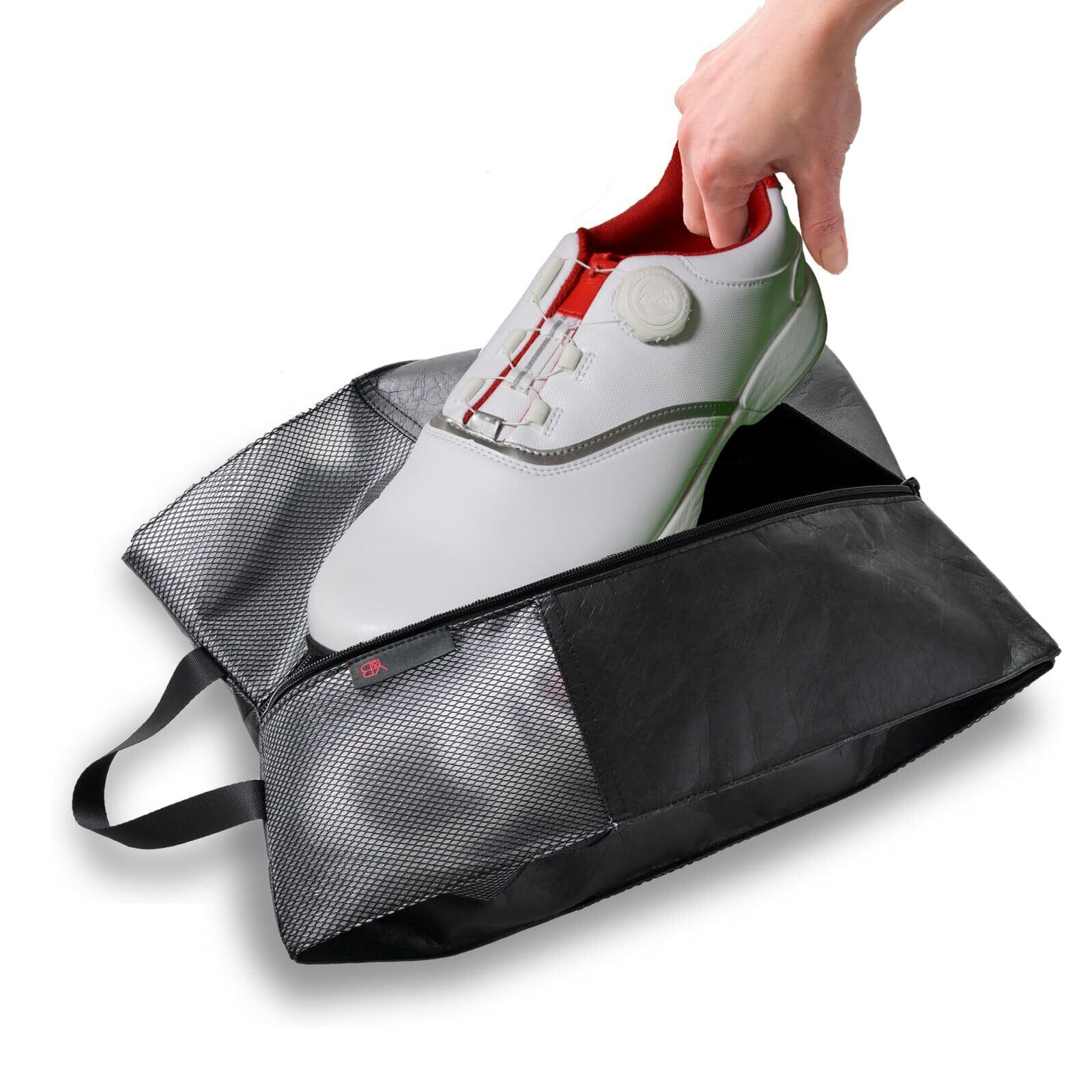 【素材へのこだわり】DuPnt社の丈夫な機能性素材「Tyvek」生地を贅沢に使用した、適度な通気性と撥水性を兼ね備えた靴に最適なシューズバッグです。TPUメッシュとのW構造だから、一目で中身が確認できます。
