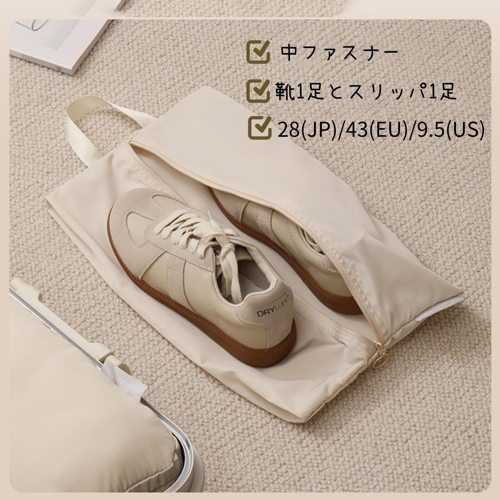 軽量設計により、持ち運びが非常に簡単!ジムや外出先での使用にも負担が少なく、気軽に持ち運べます。シューズケースとしてだけではなく、旅行用の靴袋としても大活躍します。
