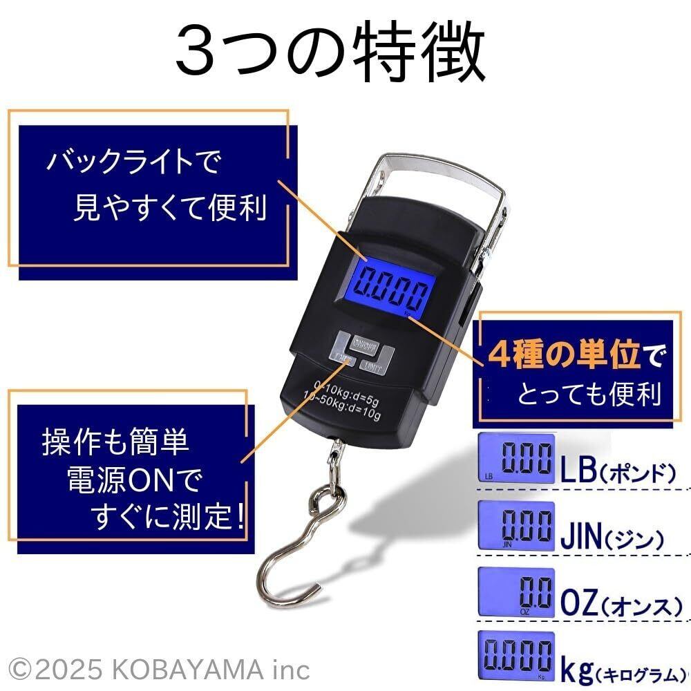 最大50kgの計量に対応し、50g単位での精密な測定が可能です。軽量設計で持ち運びに便利なため、旅行バッグやハンドバッグに簡単に収まります。また、強力なストラップが付いているので、スーツケースやリュックにしっかりと固定できます。