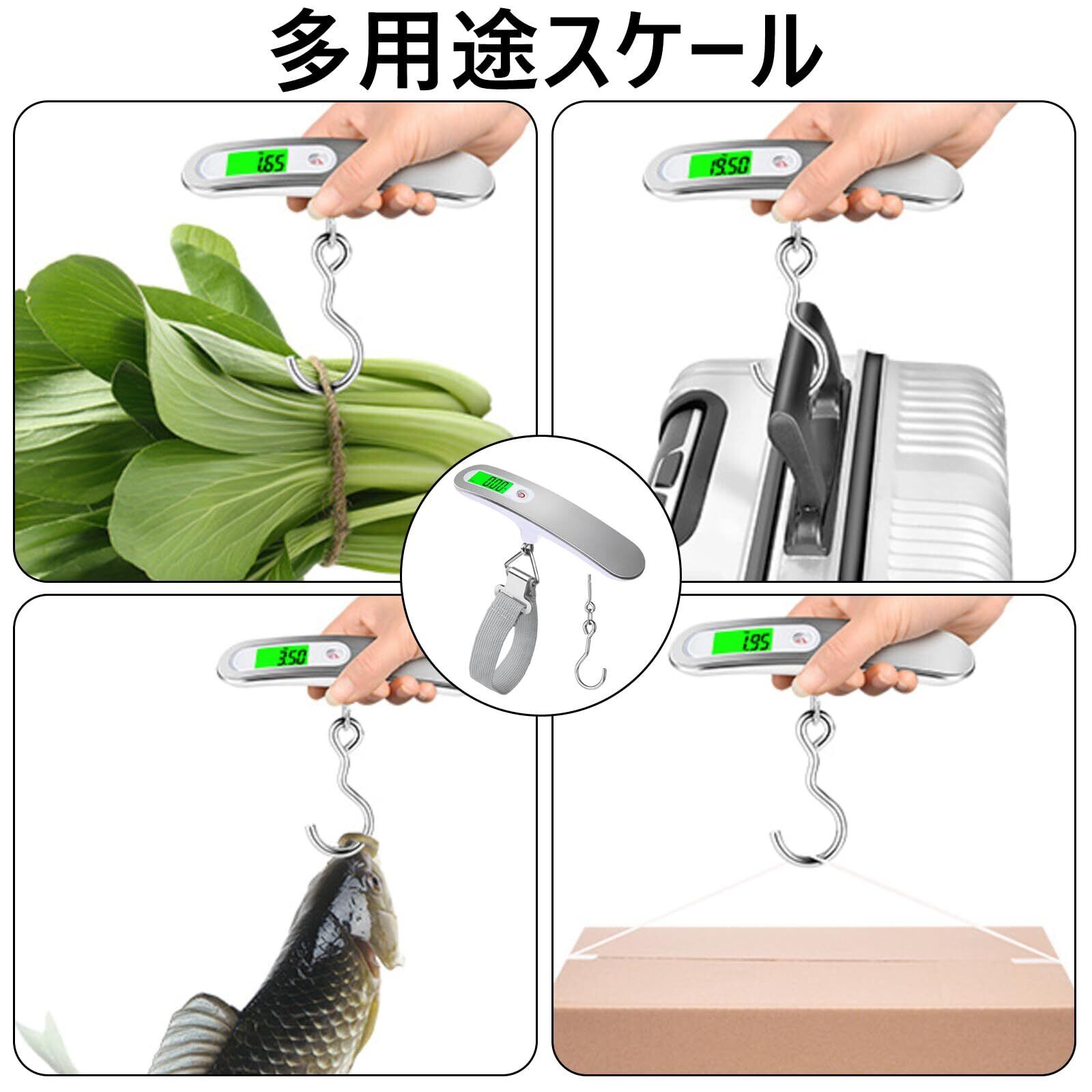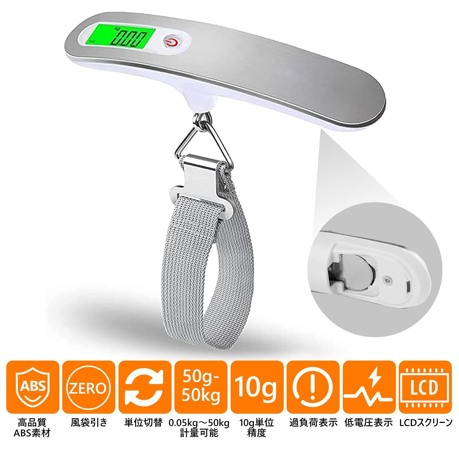 ラゲッジスケール 旅行 はかり 50kg対応 4桁LCD表示 フック+ストラップ自由選択 単位切替機能(kg/lb/oz/g) 10g高精度 最小測定50g バッテリー付属 携帯用 旅行/家庭/業務 荷物測定 コンパクト設計 軽量 風袋引き機能付 シルバー