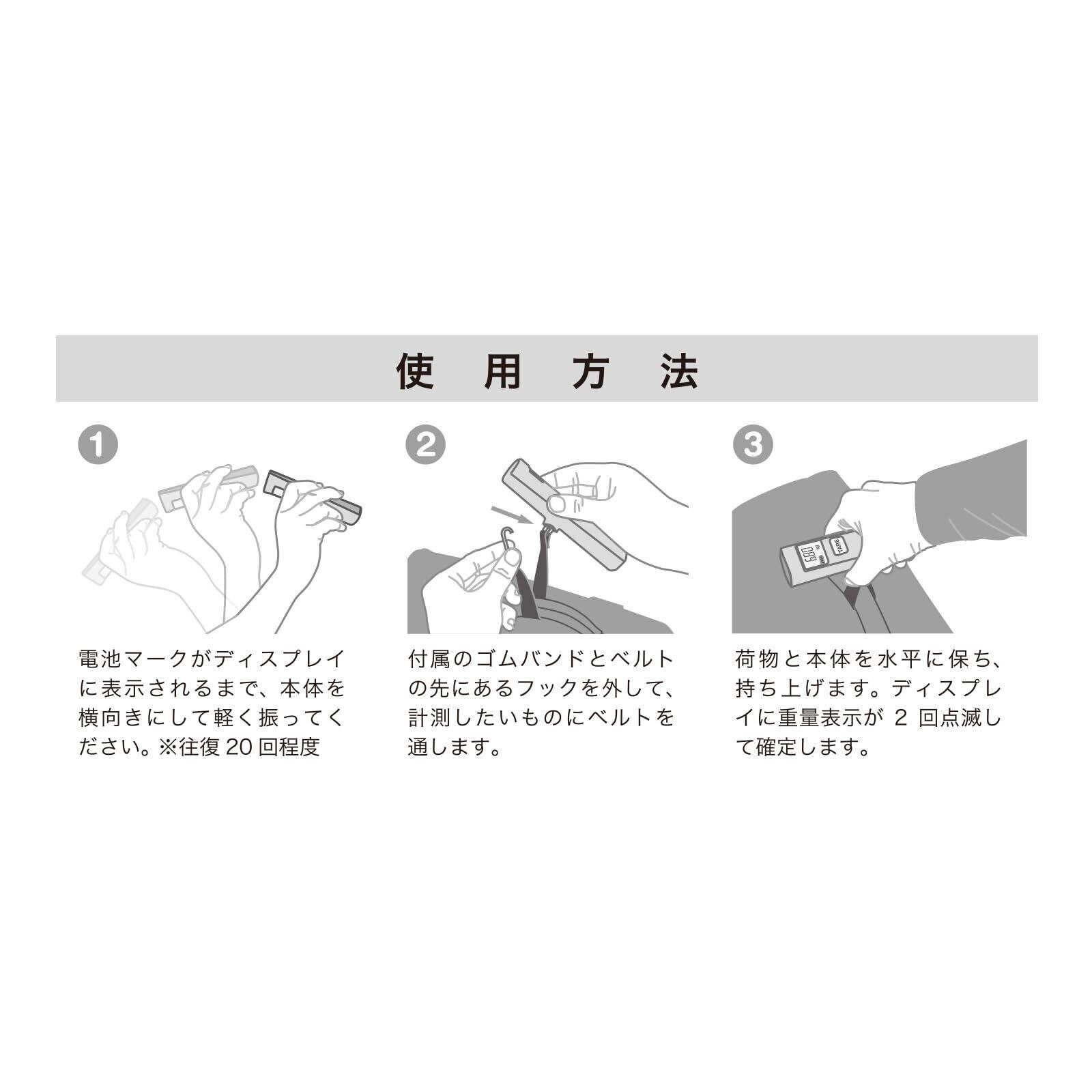 スーツケース等の旅行荷物や宅配荷物などを吊り下げて重量計測することができます。スケールを振るだけで電源が自動オン。電池を不要で振って充電することができます。