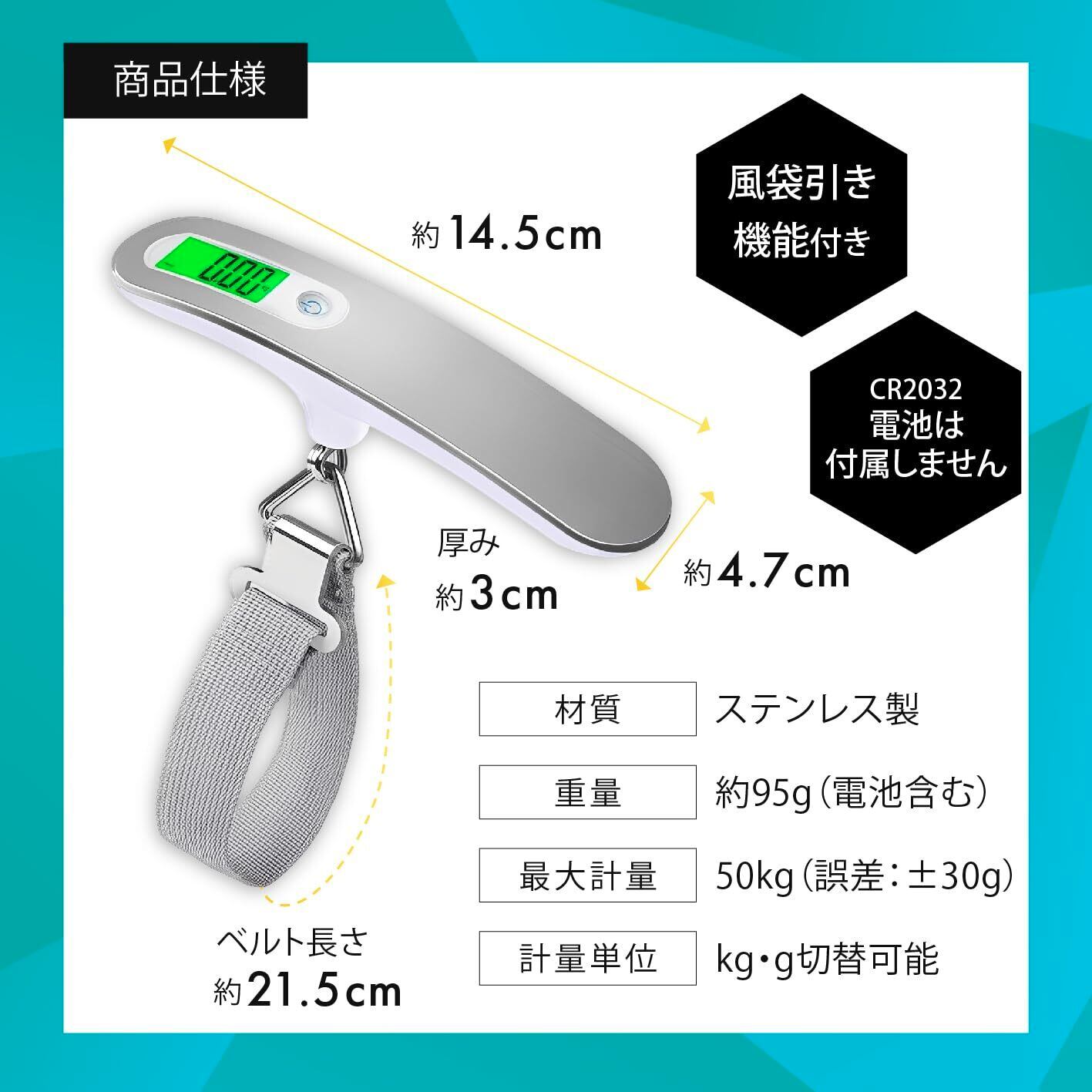 【商品仕様】サイズ:約14.5×4.7×3cm(本体)、ベルト長さ:約21.5cm/重量:約95g(電池含む)/最大計量:50kg/誤差:±30g/計量単位:kg・g切替可能/材質:ステンレス製/電池寿命:従来比30%向上 ※電池(CR2032)は付属しません。