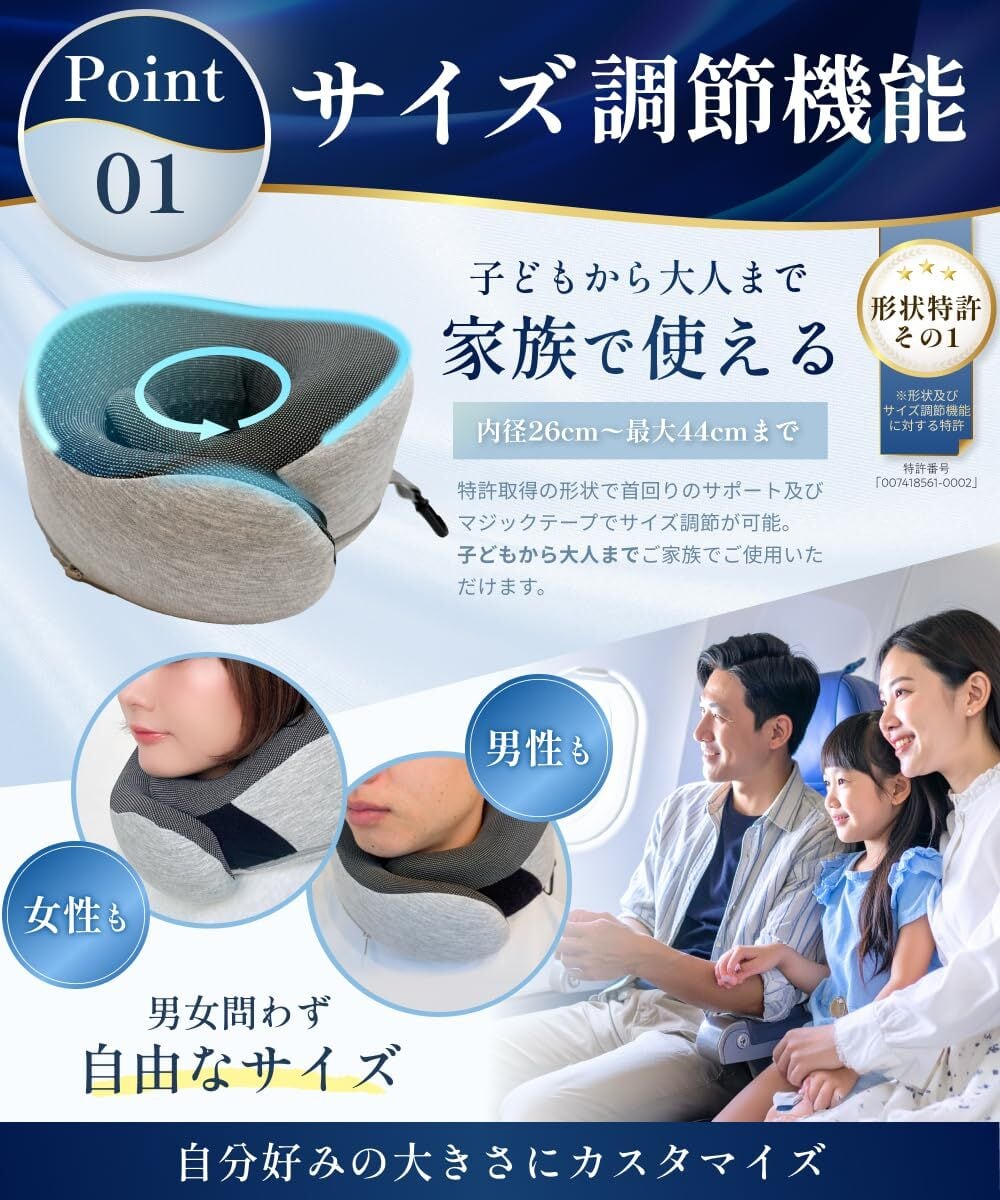 \家族みんなで使える!/【取得モデル/日本企業企画】サイズ調整可能 持ち運びフック付き[旅行用ネックピロー]で、快適な移動をサポート!