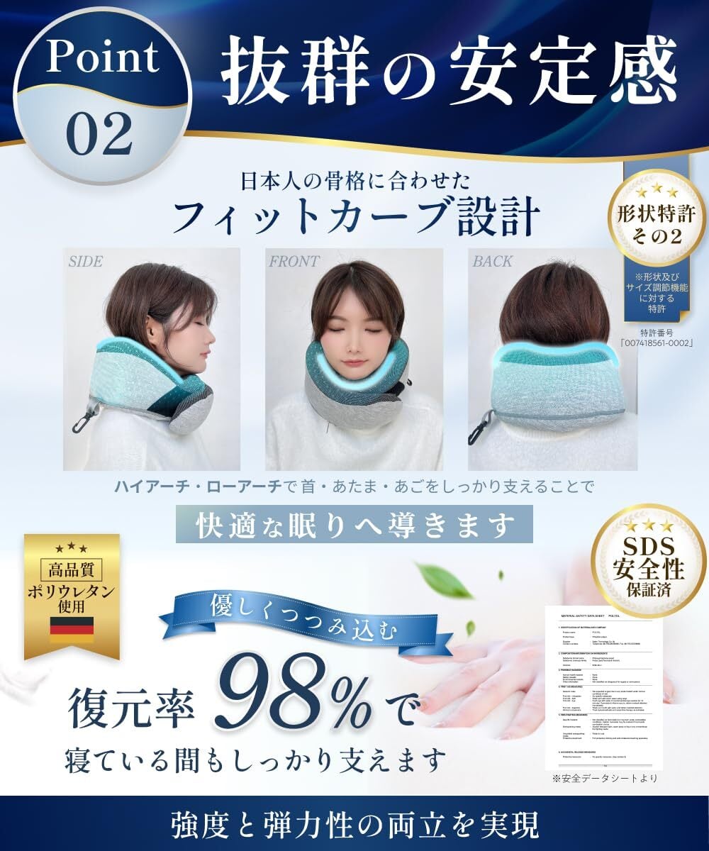 【形状&デザイン】首と頭を優しく支えるフィットカーブ設計により、首回りにぴったりフィットし長距離移動でも快適な旅行を実現します。