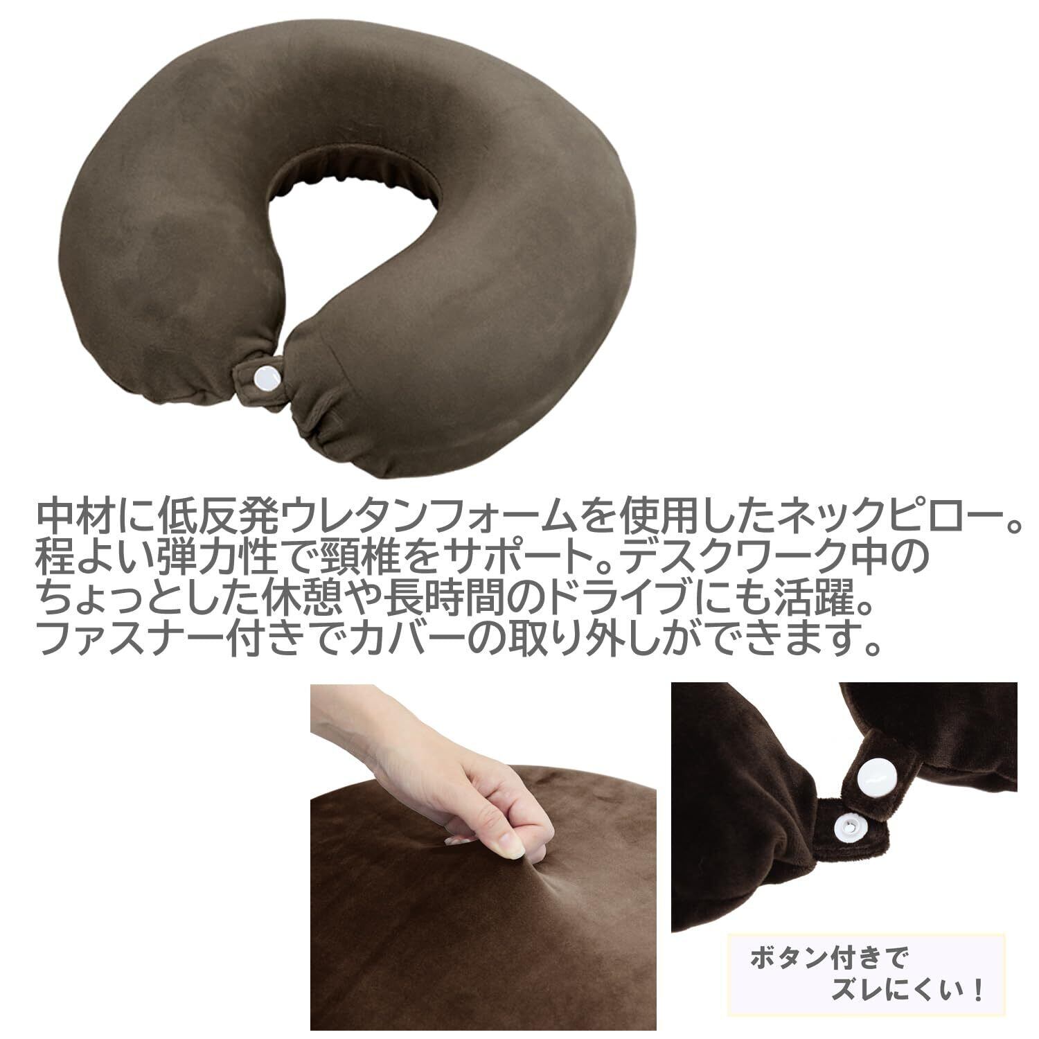 中材に低反発ウレタンフォームを使用したネックピロー。程よい弾力性で頸椎をサポート。デスクワーク中のちょっとした休憩や長時間のドライブにも活躍。首元にボタン付き、使用中にズレにくくなっています。持ち運びに便利なコンパクトサイズ。ファスナー付きでカバーの取り外しができます。カバーは洗濯可能。整髪剤やメイクのうつりなど…汚れが気になる時 洗えて清潔に使用できます。