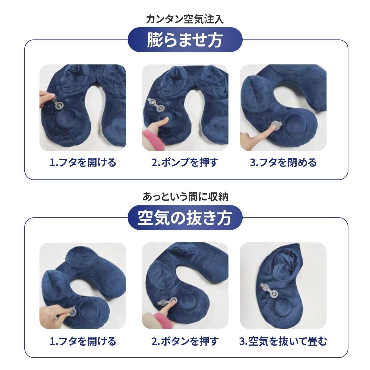 【手押しで簡単膨らみ】U字型エアークッション・ピロー手押しボタンで簡単に膨らませることができます。このネックピローは、適切な膨らみになるまで、下部にあるボタンを繰り返し押して膨らませてください。
