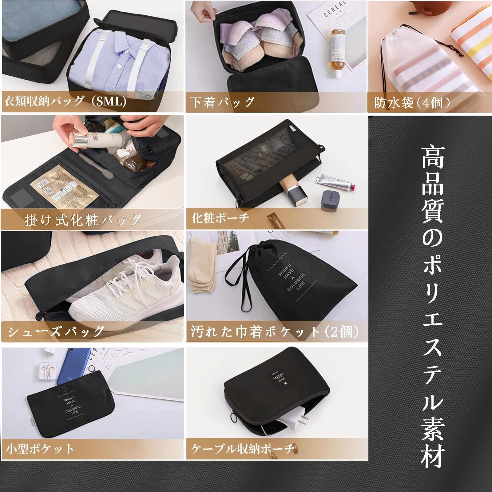 15点の多彩なポーチが含まれており、靴用ポーチや下着収納に特化したアイテムまで完備。実用的な構造により、荷物をしっかりと固定し、移動時も安心です。軽量でコンパクトに折りたためるため、使わないときも邪魔になりません。