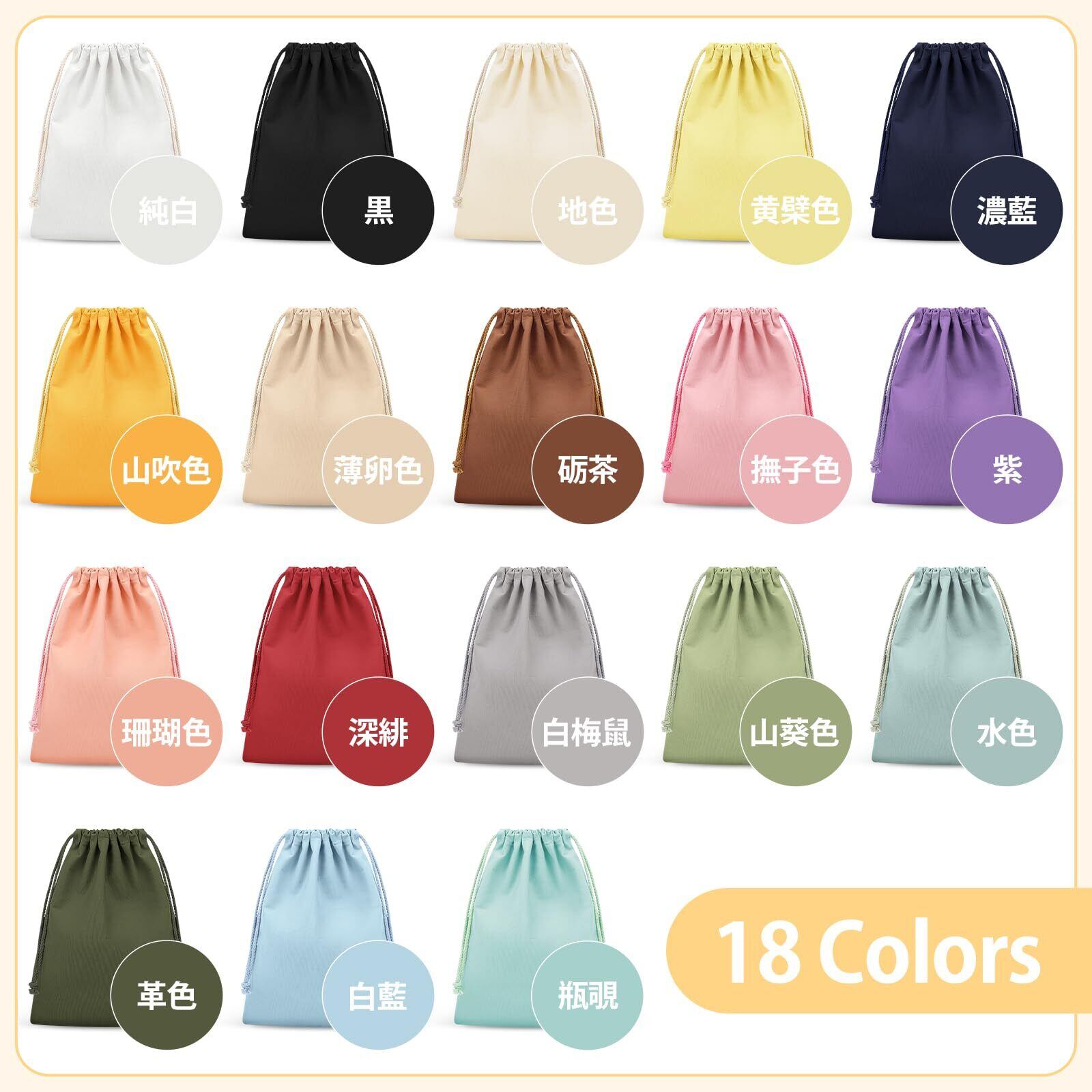 商品サイズ:Sサイズ13*16cm;Mサイズ24.5*32cm;重量:Sサイズ20g;Mサイズ55g;生地:キャンバス;色:純白、黒、地色、黄檗色、山吹色、薄卵色、砺茶、撫子色、珊瑚色、深緋、白梅鼠、水色、山葵色、革色、瓶覗、白藍、紫、濃藍。