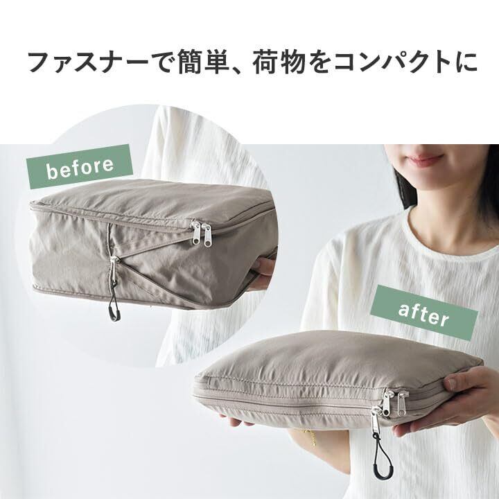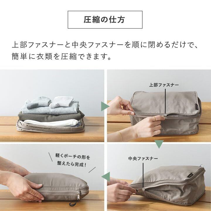 【開閉スムーズな日本製YKKファスナー】 ファスナーは安心の国内メーカー、YKK製のものを使用。ぎゅぎゅっと圧縮する時も、高品質なファスナーだからスムーズに閉めやすく、ストレスフリーな使い心地を叶える大事なポイント。 中央のファスナーには指をかけられる引き手があり、開け閉めもすーっと楽々です。