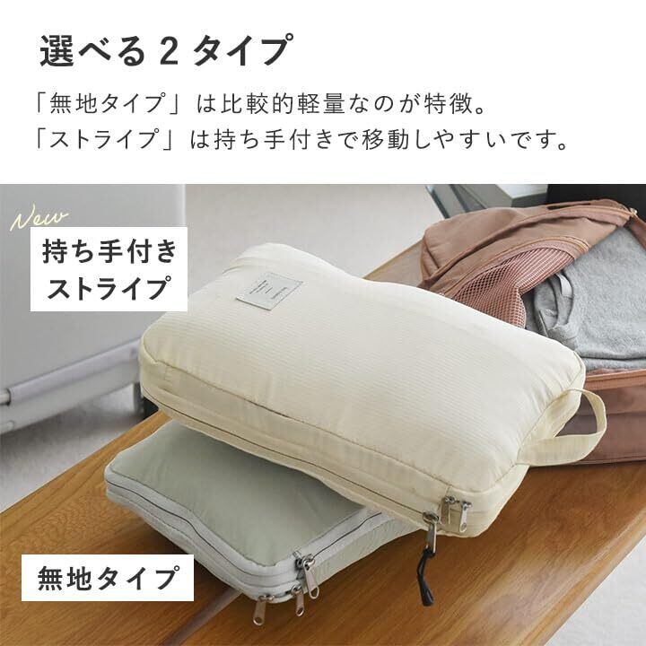 【軽い・丈夫・洗える、うれしい素材】 ポーチは「無地タイプ」と「ストライプ」の2種類。 無地タイプは全体に、摩擦に強いナイロン素材を使用。比較的軽量なので、荷物の多い旅行シーンでも負担になりません。 ストライプは表面感のある素材を使用。ポリエステル素材なのでシワになりにくく、お手入れもしやすい素材です。 どちらの素材も耐久性が高く、洗濯ネットに入れればお家で丸洗いもOK。 「使用済みの衣類を入れたから、ポーチも洗っておきたい。」そんな時にも気軽にお手入れができます。