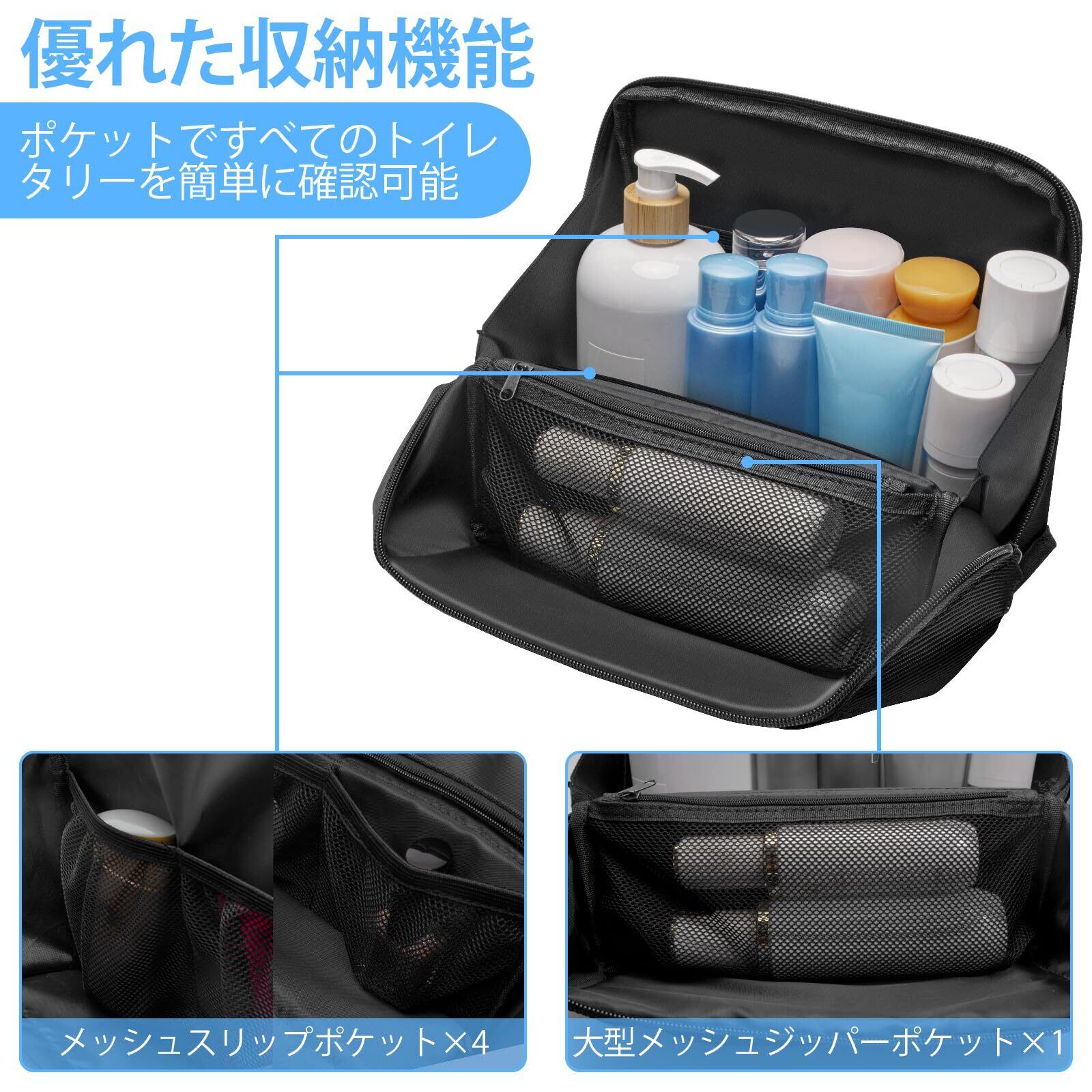大容量化粧ポーチ: このトラベルポーチは開いた状態で26 × 12 × 21cmのサイズで、メインコンパートメント、4つのメッシュポケット、1つのファスナーポケットを備えています。化粧品、洗面用具、ブラシ、その他のツールをきれいに整理できます。広々としたメインコンパートメントは500ml以下のフルサイズの洗面用品や化粧品も収納可能で、出張や一泊旅行に最適です