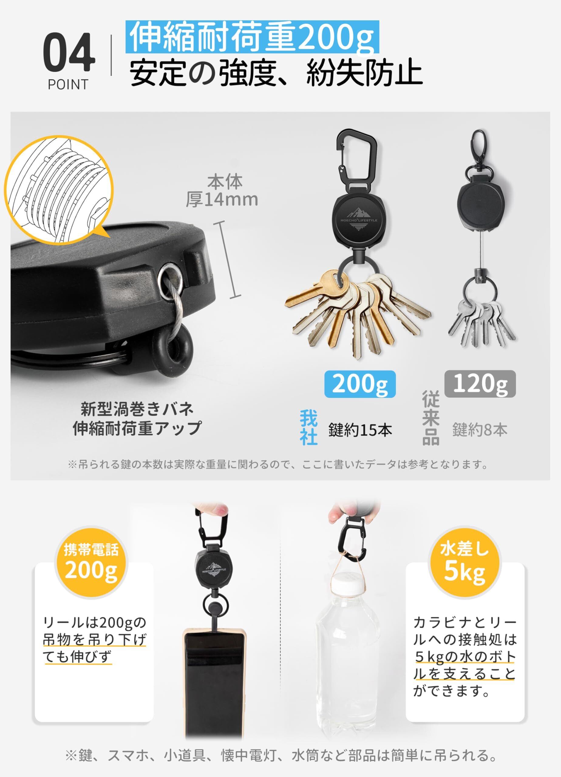 [MOECHO] リールキーホルダー 強力 キーチェーン 【新登場改良型·多機能·200g伸縮耐荷重】 カラビナ キーホルダー リール 頑丈 キーチェーン 伸びる 鍵 キーホルダー ストラップ 金属ワイヤー 落下