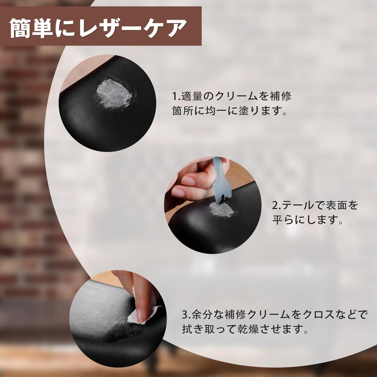 【使いやすい】▲1.傷ロの汚れやほこりを落としてから、適量のクリームを補修箇所に均一に塗ります。▲2.テールで表面を平らにします。▲3.余分な補修クリームをクロスなどで拭き取って乾燥させます。(補色が不十分だと感じた場合は、もう一度塗って、複数の補色層を形成します。)