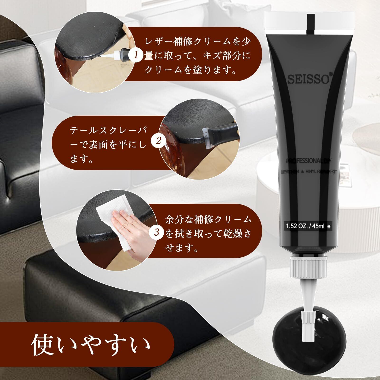 [SEISSO] 革製品 補修 レザー補修クリーム 合成皮革補修 キズ補修 革補修クリーム 革色落ち補修 保革クリーム 革シート レザー補色 革ハンドル 合成皮革 本革ソファ 財布 革靴 車の座席 ベルト 革のひび割れ 擦り傷 色あせ 皮革 レザー
