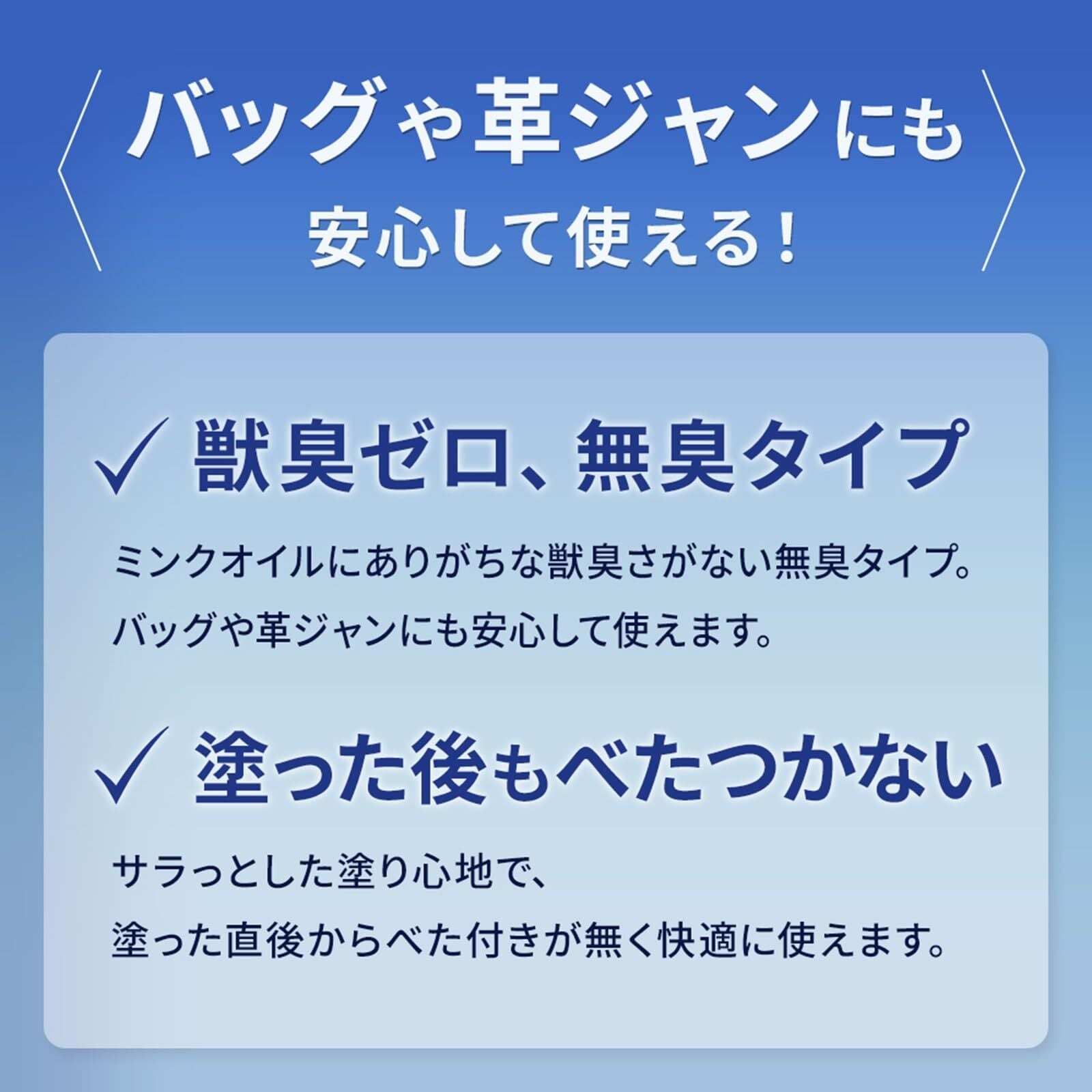 使いやすい無臭タイプなので、革ジャケットやグローブなど身に着けるレザーアイテムにも安心して使用できます。