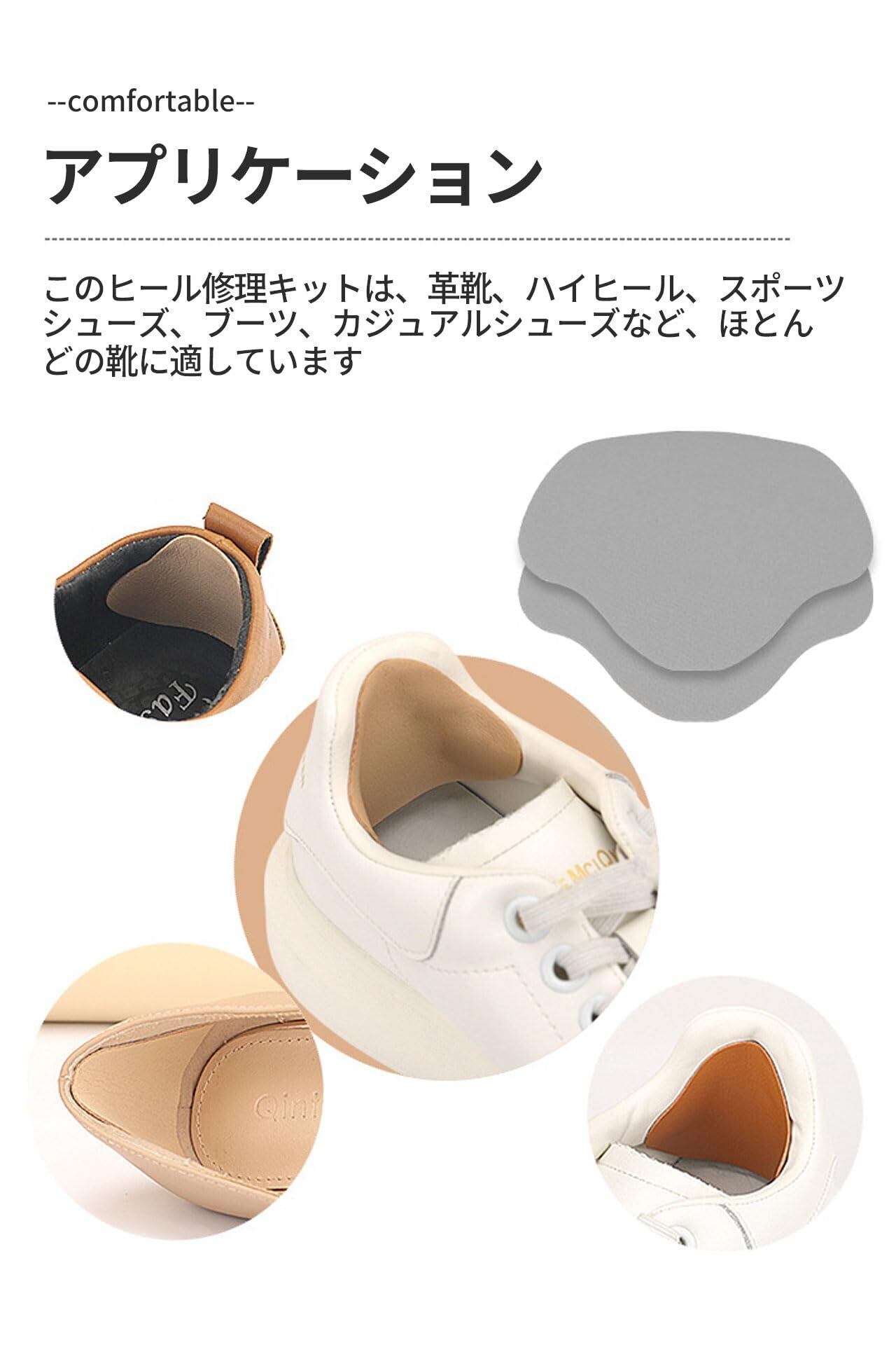 使用方法: 1. 靴のかかと部分の汚れやホコリを布などで拭き取ります。 2. リペアパッドの裏面のシールを剥がします。 3. 破損部分やすり減った部分に直接貼り付けます。 4. 靴の形に合わせてハサミでカットし、しっかりと貼り付けます。