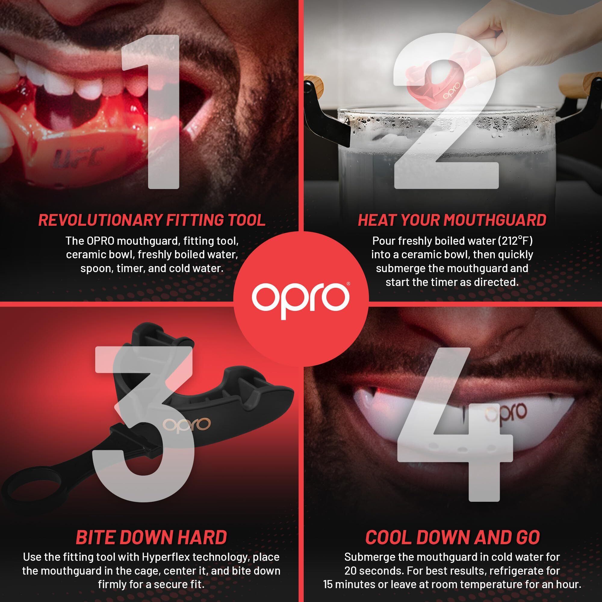 OPROの取得済みのフィッティングハンドルを使用して、マウスガードを歯と歯茎の周りにフィットするように成形します。 ステップバイステップガイドについては、パッケージの指示に従ってください。