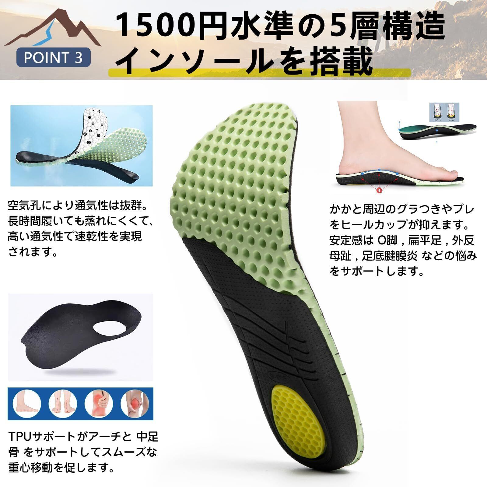 快適な履き心地で長時間使用可能 高いクッション性を持つインソールと、足にフィットする設計で、長時間の歩行でも快適さを維持します。通気性に優れた素材を使用し、湿気を効率的に逃がすことで、特に夏や湿気の多い環境でも快適に使用できます。山歩きやウォーキングなど、アウトドア活動にも最適です。