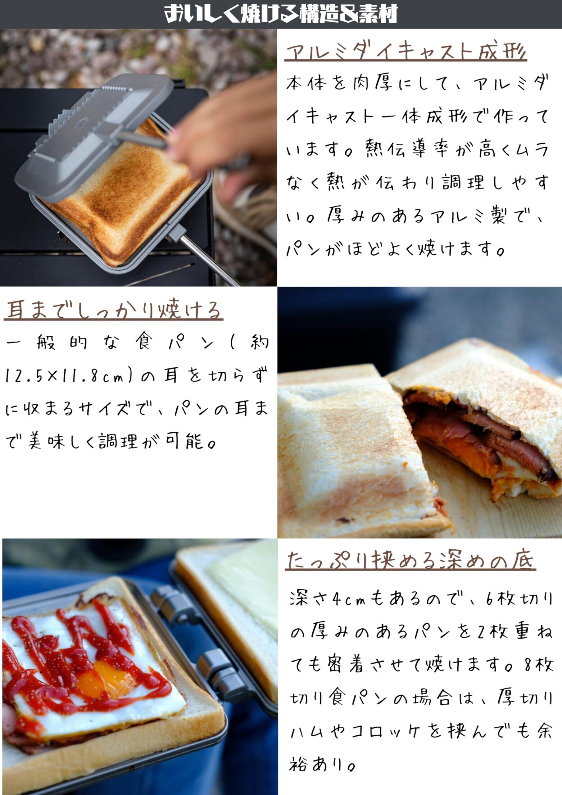 このホットサンドイッチクッカーには、アウトドア料理をサポートする特長が満載です。