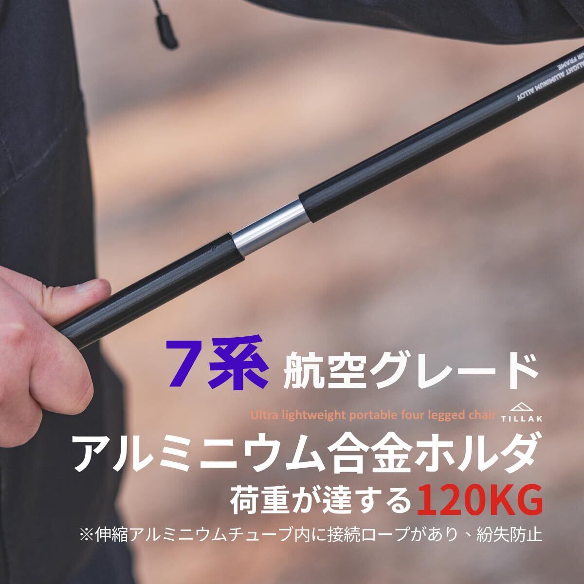 【強度と軽量化について】このチェアは7系航空グレードアルミニウム合金フレームを採用し、軽量化を実現しつつ、高い強度を両立しています。わずか650gの超軽量設計(飲料1本分の重量)でありながら、耐荷重120kgを実現。ハイキングやキャンプの移動時にも、非常に軽快にお運びいただけます。