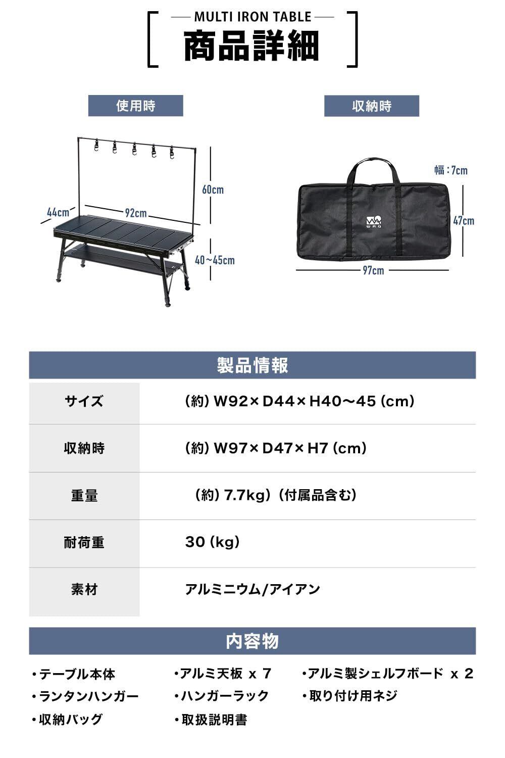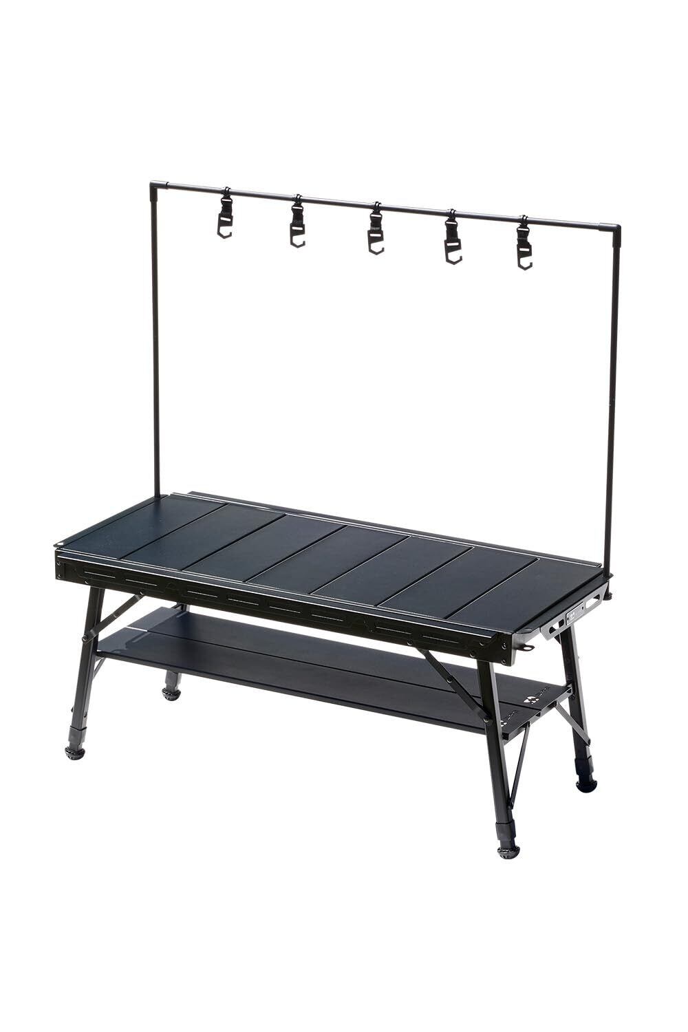 【ほしい機能が詰まったテーブル】・アルミ製天板採用:テーブルの天板にはアルミニウムとウッドの天板を採用。・+5cmの高さ調整機能付き:お使いのチェアの座面に合わせて高さを変更可能です。・アルミ製シェルフボード:テーブル下のスペースを有効活用していただけます。・2種類の拡張パーツ付き:ランタンハンガー、ハンガーラック2種類の拡張パーツが付属します。・使い勝手の良い天板サイズ:92cm x 44cmで使いやすいサイズ感です。