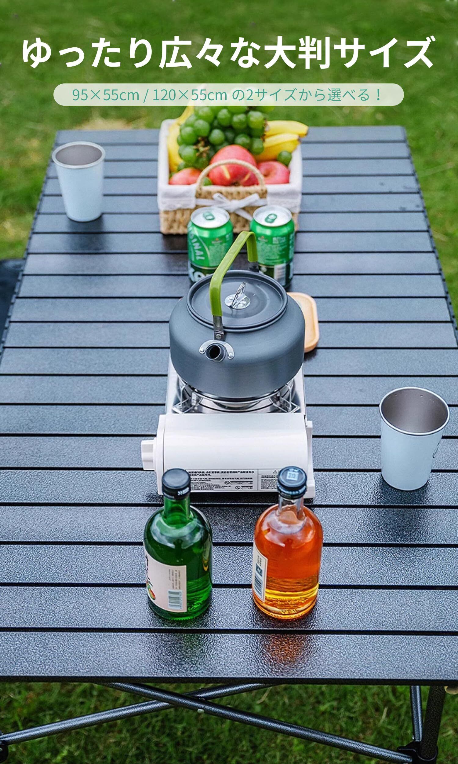 【シーンで選べる2サイズ展開|用途に応じてぴったりサイズを】95cmと120cmの2サイズ展開で、ソロキャンからグループまで幅広く対応。アウトドア 折りたたみ テーブルとして万能に活躍します!