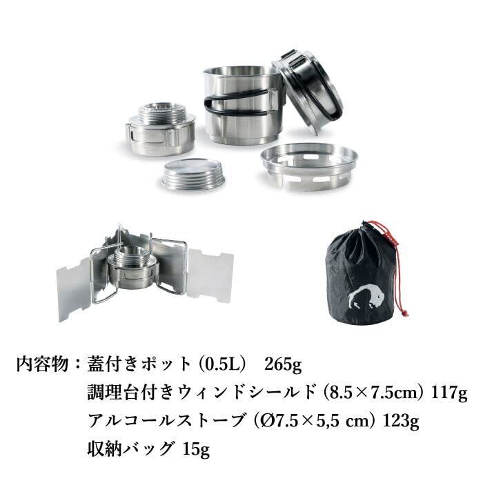 付属品:◆蓋付きポット 0.5L ◆アルコールストーブ120ml ◆調理台付きウィンドスクリーン ◆収納バッグ
