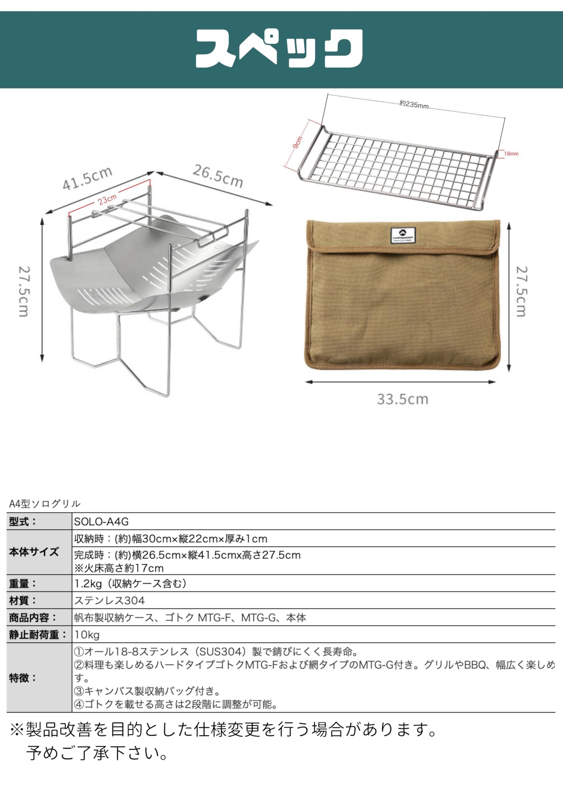 キャンピングムーン(CAMPING MOON) A4型 ソログリル 焚き火台 ソロ 焚火台 焚き火グリル ステンレス304 焼き網 帆布ケース 付 SOLO-A4G