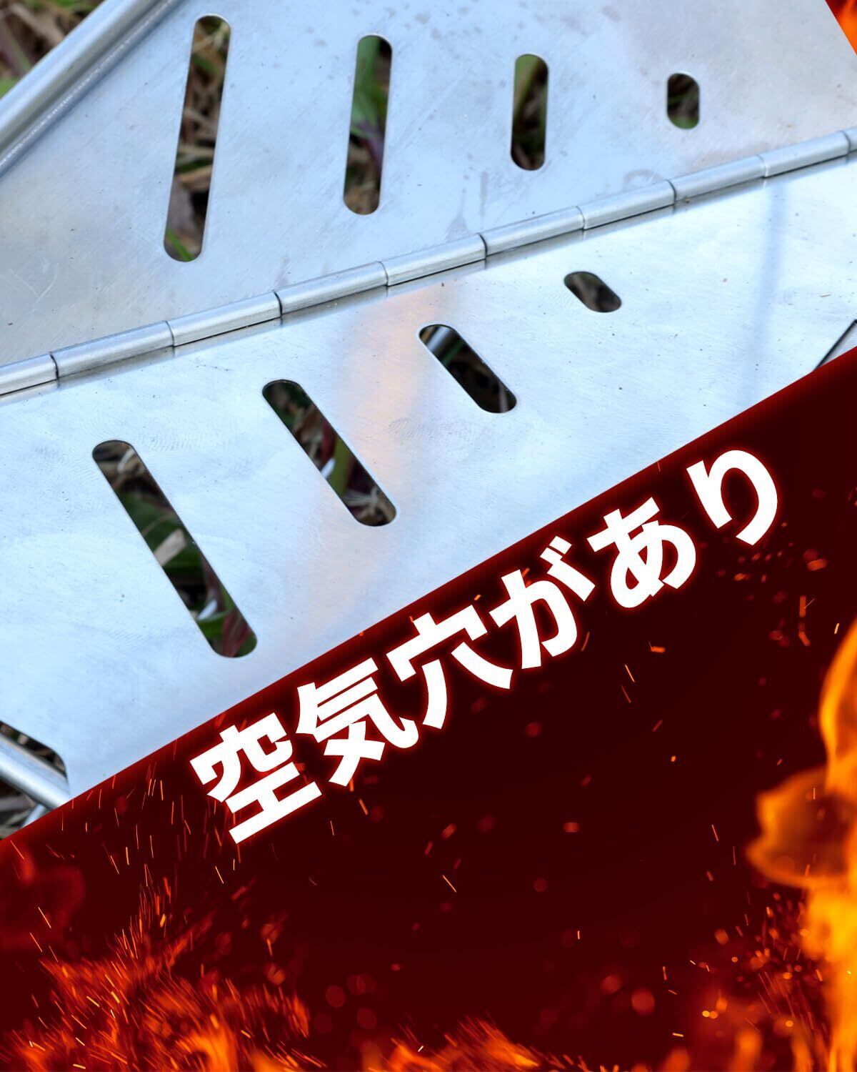 【高い燃焼効率】 底部には専用の通気孔が備わり、優れた通気性を確保し、燃焼効率を向上させ、より良い焚き火体験をもたらします。この折り畳み式焚き台はステンレス製で、全身水洗可能なため、錆など心配はありません。
