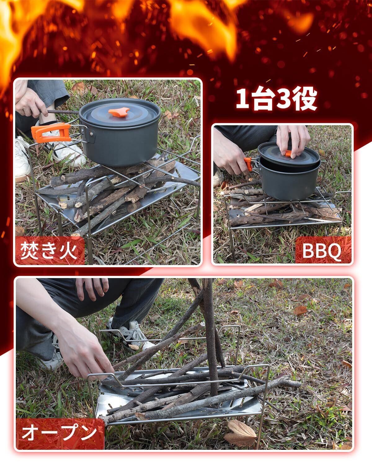 【オールインワンの調理体験】ロストルの微調整で多彩な調理が可能。焚き火、バーベキュー、煮物、焼き串など、1台でさまざまな調理方法に対応。コンパクトながら多機能で、アウトドアシーンでの使い勝手が抜群です。