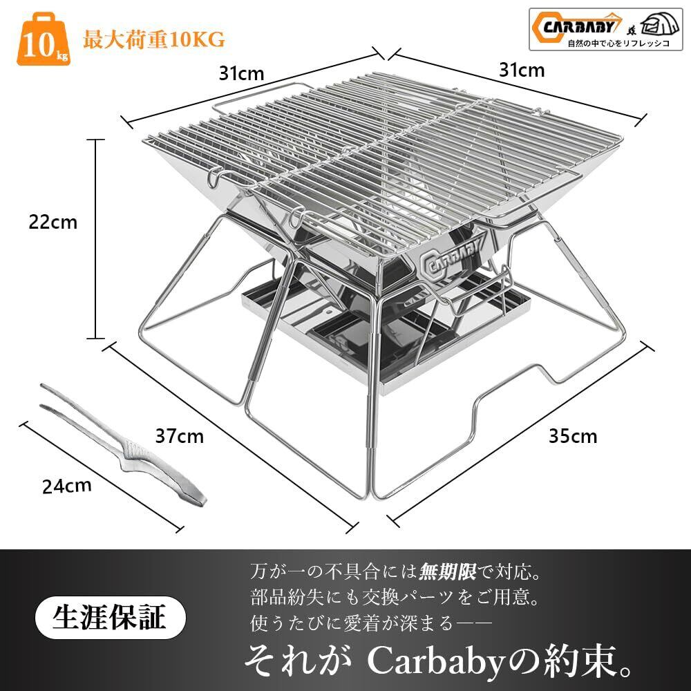 【商品仕様】 本体と焼き網の材質:ステンレス、収納サイズ:39×22.2×5.5cm、展開サイズ:37×35×22cm、焼き網サイズ:31×31cm、およそ2~4人ぐらいのファミリーやグループでBBQするには丁度良いサイズです。