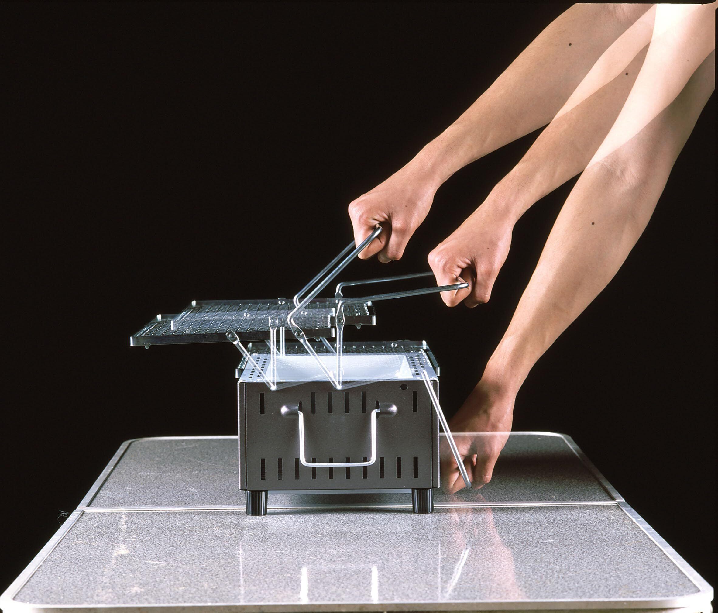 【食材を動かさずに炭の足し増しが簡単】ハンドルを上に上げることで、網が上に上がります。網を動かしたり網の上の食材を移動させたりせずに、炭の足し増し・火力調節ができ便利です。