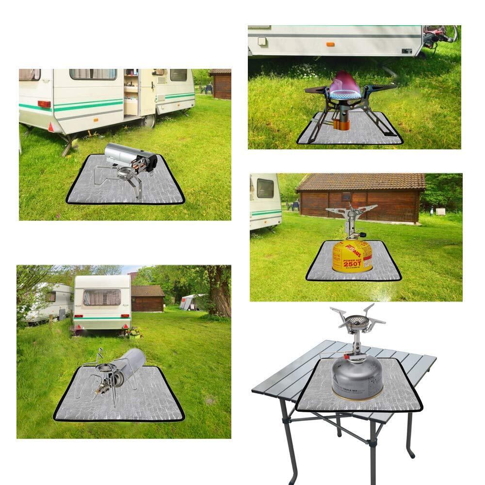 【使用する前の注意事項】この耐熱シートは断熱性があり、熱から大事なテーブルと地面を守ります。ただし、バーナーに直接的に高温の物体を置かないでください(例えば、高温の鍋、高温の鉄板、高温のグリル)。そうでなければ一定の熱量のダメージを受けて、アルミ蒸着フィルムが溶けたり剥がれたりする可能性があります。