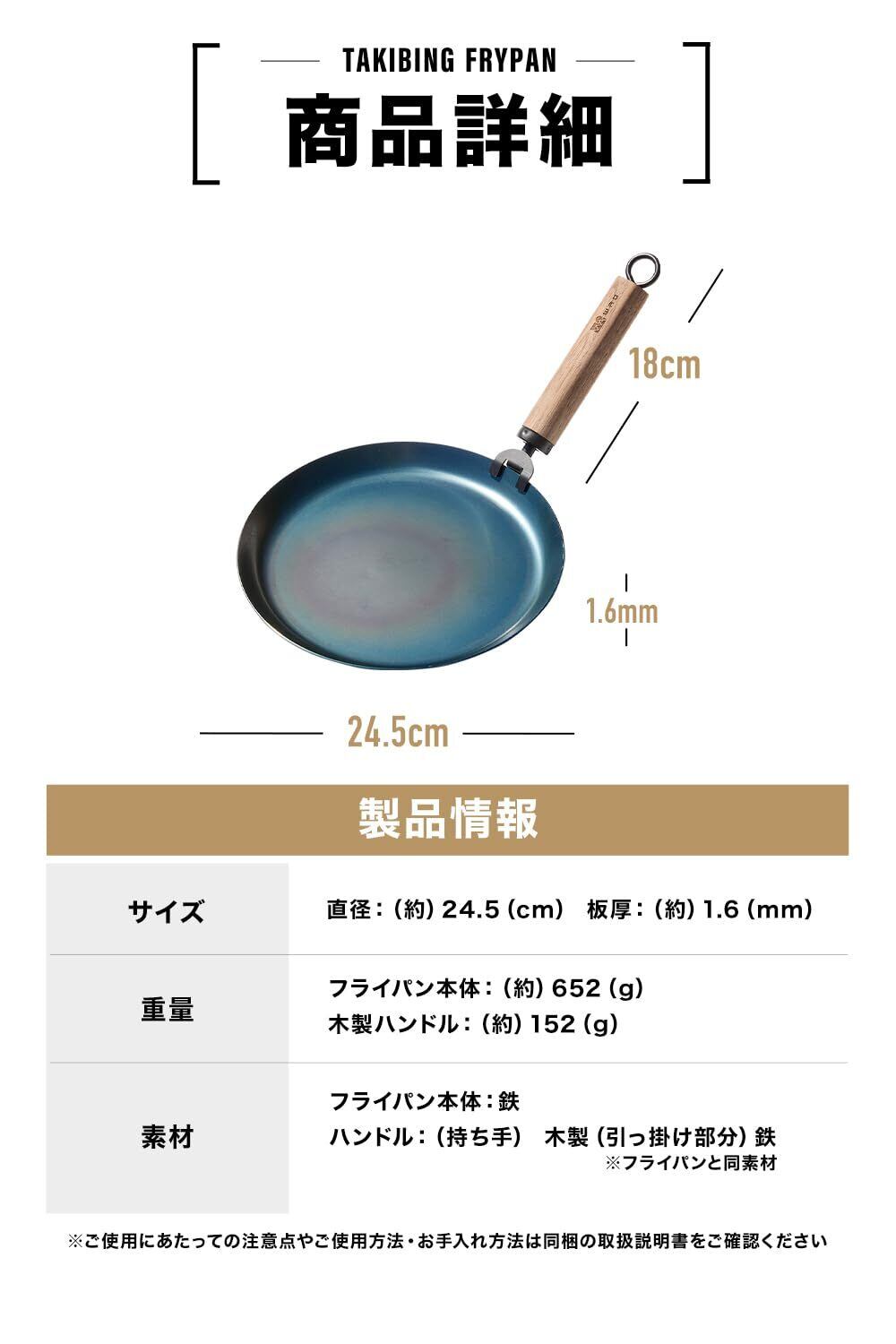TAKIBING FRYPAN 焚き火フライパン 鉄フライパン WAQ IH対応 焚き火 直火 ガス 日本製 軽量 24.5cm 鉄鍋 ハンドル分離 (TAKIBING フライパン+ハンドルセット)