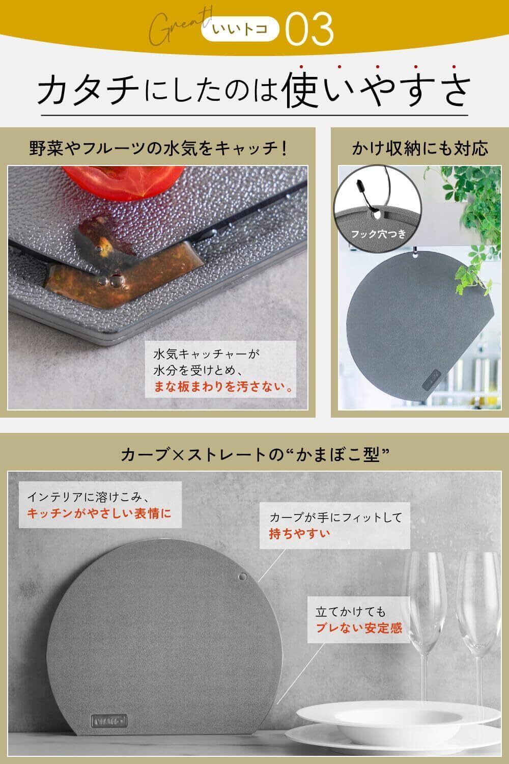 【日 本 製 の 安 心 感】食材が直接触れるものだから、やっぱりMade in Japanが安心。日本のキッチンのことを考えられたデザインで、コンパクトなスペースでも料理しやすい設計。円状の周囲にカット済み食材を置き、中央に作業スペースを設けることで、広く使えるからスペパ抜群。さらに両面使える仕様です。