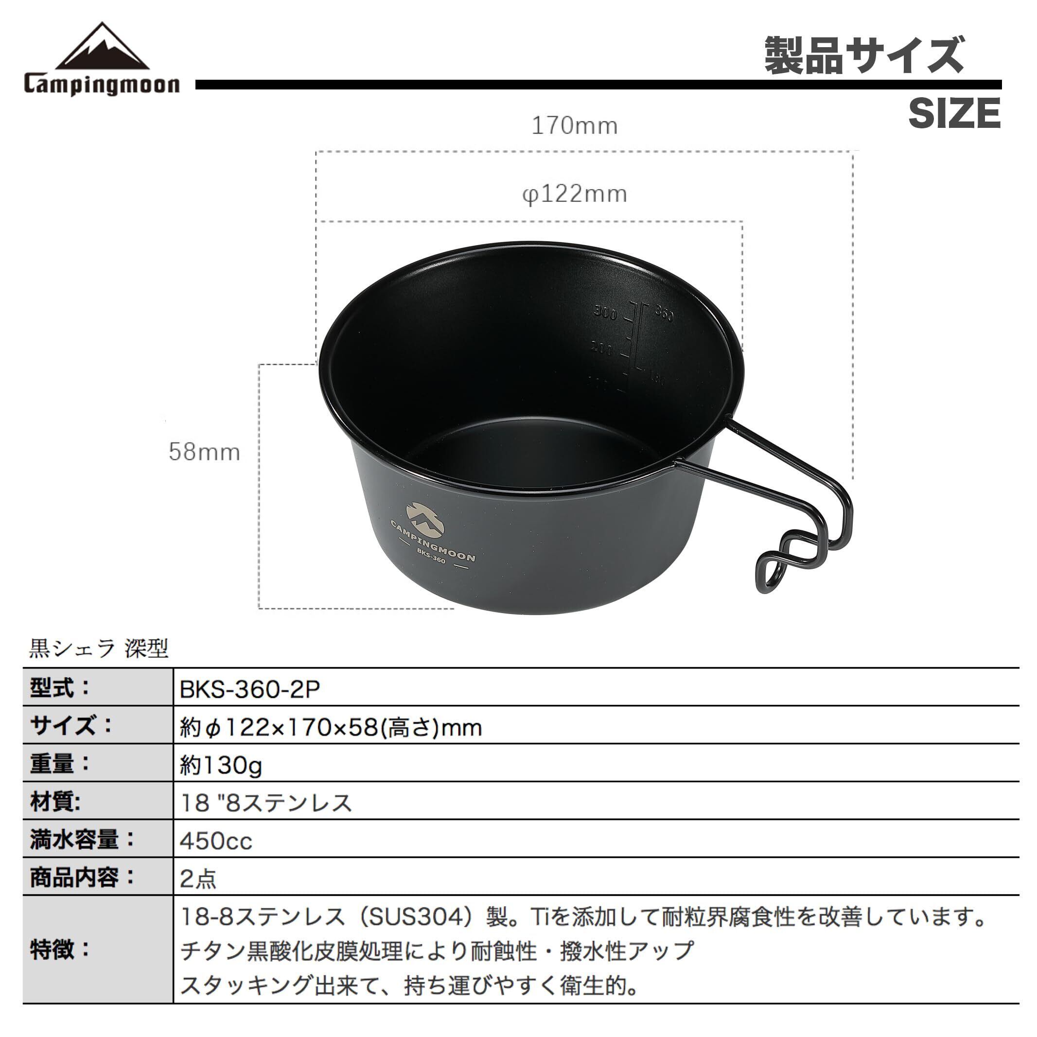 キャンピングムーン(CAMPING MOON) キャンプ用 コップ ステンレス シェラカップ 黒 深型 黒シェラ 360ml 2点セット BKS-360-2P