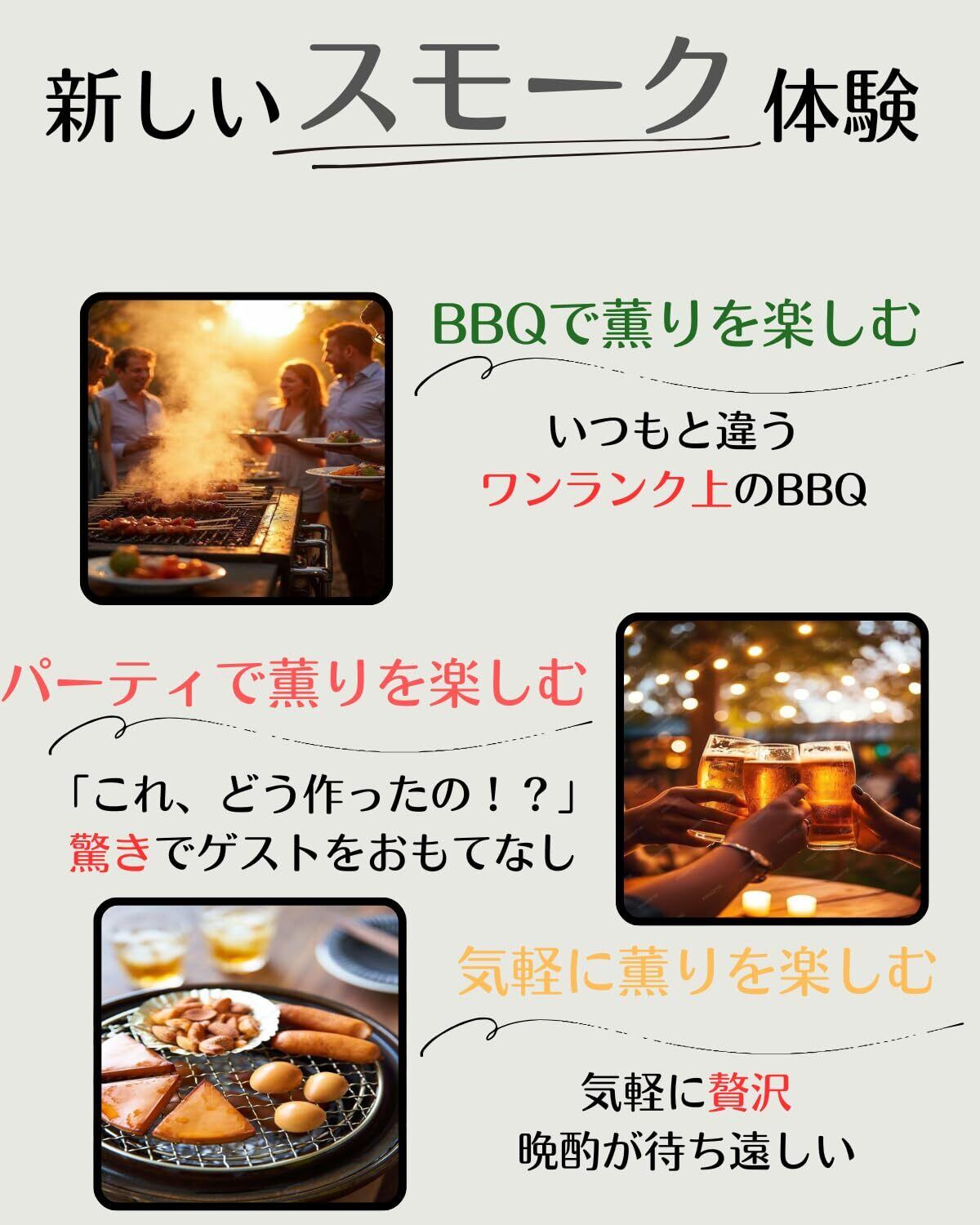 【気軽に楽しめるセット】【初心者も安心トライアルセット】人気の3種(サクラ・ナラ・ブナ)が試せる少量セットです。 【人気の定番3種を厳選&使い分け】 ●[サクラ]:香りが強く、鶏ももやサーモンなどクセのある食材に負けない「燻製の王道」。 ●[ナラ]:色づきが良く、ビーフやチーズのほか、魚、鶏肉など淡白な食材にも合う「万能選手」。 ●[ブナ]:薫りが穏やかでクセがなく、素材の風味を上品に活かす「優等生」。 これ1つで、食材に合わせた「香りの食べ比べ」が楽しめます。 【無駄なく使い切りサイズ】 各100gの使いやすいパックなので、「大きな袋を買って余らせてしまった」という失敗がありません。ソロキャンプでのおつまみ作りや、ご家庭のフライパンでちょっとだけ燻製を楽しみたい時、BBQでの「味変」にも最適です。 【安心の国産天然木100%】 燻製材の専門メーカー「進誠産業」が手掛ける高品質なスモークチップ。原料はすべて国産の天然木のみを使用。添加物などは一切使用していないため、食材にピュアな木の香りをまとわせます。 【手軽な熱燻から本格燻製まで】 ご家庭のフライパンや中華鍋を使ったお手軽な熱燻(ねっくん)はもちろん、本格的なスモーカー(燻製器)を使った温燻・冷燻まで幅広く対応します。キャンプ、BBQ、ご家庭のキッチンでも、アイデア次第で楽しみ方が広がります。 「燻製のある生活」を、もっと気軽に。 「燻製に挑戦してみたいけど、道具を揃えるのが大変そう…」 「どのチップを選べばいいかわからない」 「大きな袋は使いきれるか不安…」 そんな「燻製はじめの一歩」を応援するために、このお試しセットは生まれました。 ◆ 気分と食材で使い分ける、個性豊かな3つの香り 燻製の楽しさは、食材とチップの香りの組み合わせにあります。このセットは、初心者の方でも失敗しにくい「定番の3種類」を厳選しました。 サクラ (SAKURA) - 燻製の王様 最もポピュラーで、香りもしっかり。鶏もも、サーモン、たまごなどの定番食材のほか、トン、レバーなど、クセの強い食材とも相性抜群です。美しい色づきも特徴です。 (おすすめ食材:鶏もも、サーモン、たまご、マトン、ソーセージ、魚介類) ナラ (OAK) - 万能な名脇役 クセが少なく、どんな食材にも合わせやすいオールラウンダー。ほのかに漂う森の香りが、魚や肉、カマンベールチーズなどの風味を上品に引き立てます。色づきが良いのも嬉しいポイント。 (おすすめ食材:ビーフ、チーズ、豚ロース) ブナ (Beech) - 薫りが穏やかでどんな素材でも風味を上品に活かしてくれます。いつもの食材がワンランク上の一品に。(おすすめ食材:ハム、白身魚、かまぼこ) ◆ ソロキャンプにも、いつもの晩酌にも。 各100gの使い切りサイズだから、楽しみ方も自由自在。 ご家庭で: フライパンにアルミホイルを敷き、チップをひとつまみ。網を置いていつものチーズやナッツを乗せ、蓋をして火にかけるだけ。わずか10分で、極上のおつまみが完成します。(※熱燻の場合。換気は十分に行ってください) アウトドアで: ソロキャンプの焚き火のお供に。BBQでいつものお肉にスモークの香りをプラスする「味変」アイテムとして。荷物にもならないコンパクトサイズです。 ◆ 安心・安全の品質を「進誠産業」から 製造は燻製材の専門メーカー「進誠産業」。 原料はすべて国産の天然木100%。安心してお使いいただける高品質なスモークチップで、あなたのスモークライフの第一歩を応援します。