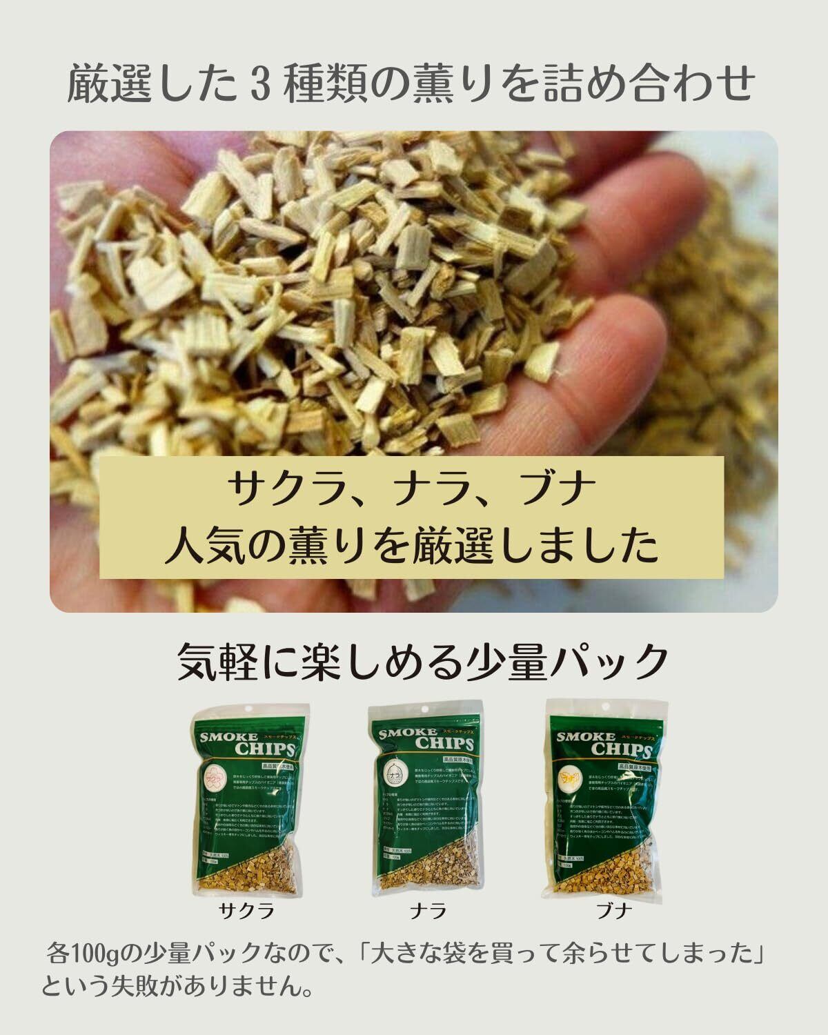 内容量: 合計300g (サクラ 100g, ナラ 100g, ブナ 100g) 原材料: 国産天然木100% ブランド: 進誠産業 対応: 熱燻、温燻、冷燻(すべての燻製方法に対応)