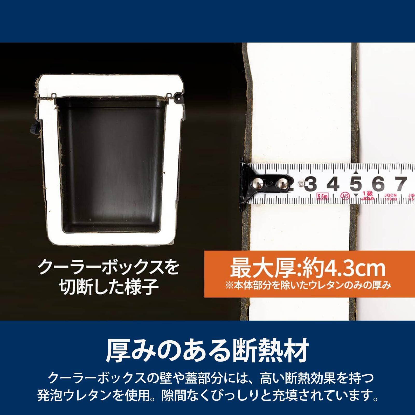 【高い断熱性と密閉力】 断熱材には高い断熱効果を持つ発泡ウレタンを採用。クーラーボックスの壁や蓋部分に隙間なくびっしりと充填することで、高い保冷力を実現。 さらに、蓋と本体の接触部分には発泡シリコンパッキンを埋め込み、外部の熱を伝わりにくくしました。 密閉力が高く、長時間の保冷効果を維持できるよう設計しています。
