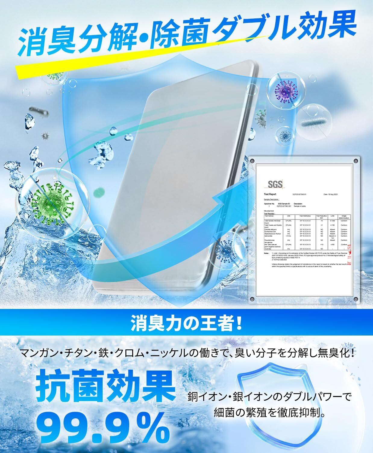 POINT 2:【除菌消臭分解ダブル効果】 密閉性の高いステンレス外装で菌や臭いを寄せつけない。さらにマンガン・チタン・鉄・クロム・ニッケルが臭い分子を分解し無臭化。銅・銀イオンが細菌の繁殖を99.9%抑制。