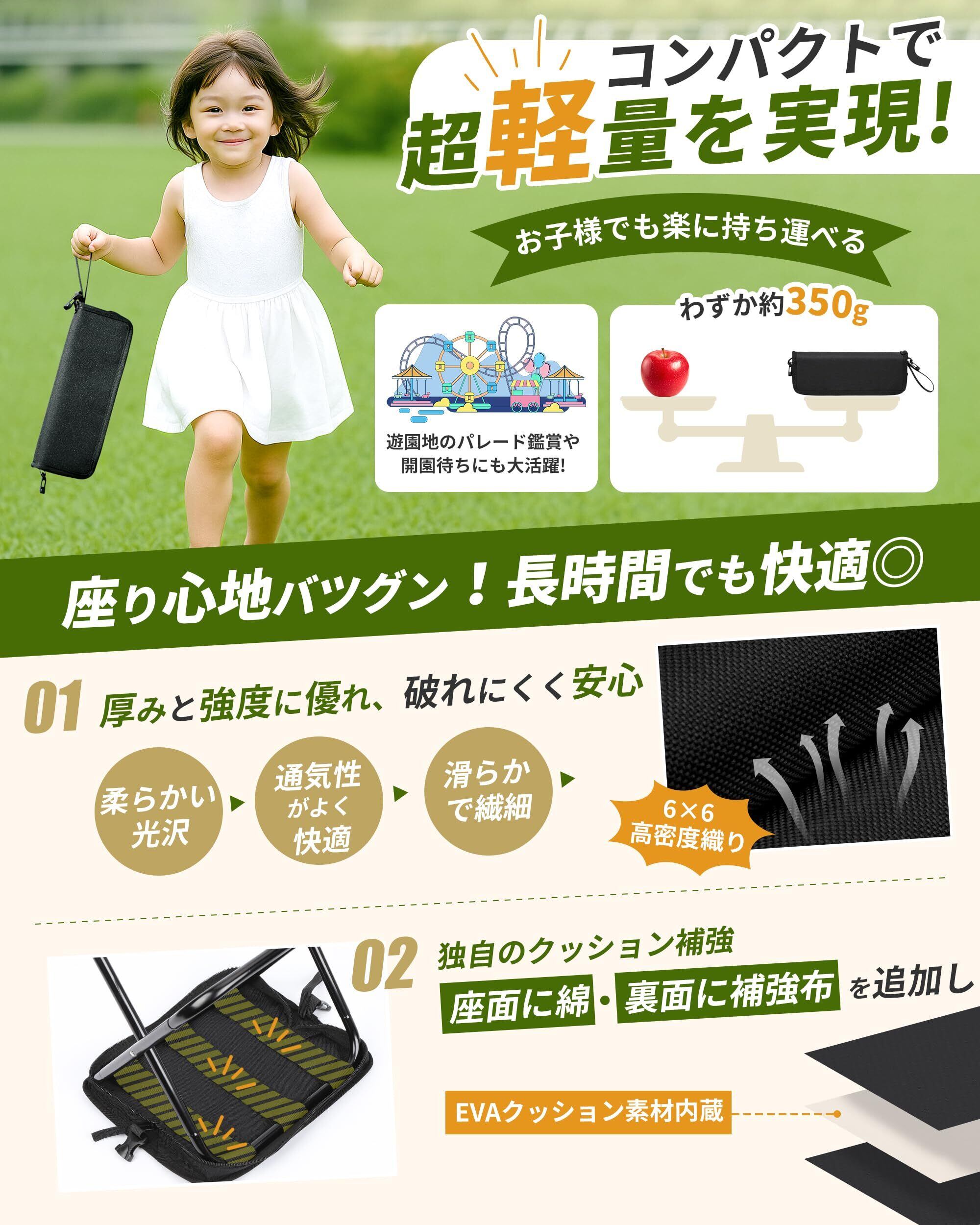 【活躍シーンは無限大】キャンプ、登山、釣り、BBQ、フェス、運動会、花火大会、ピクニック、観戦など、日常からアウトドアまで大活躍。バッグのように携帯でき「座りたい時にすぐ座れる」折りたたみチェアです。