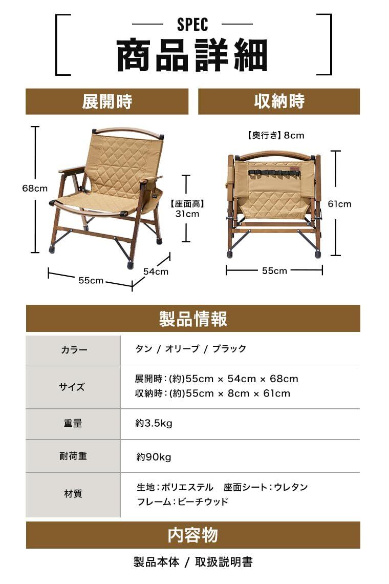 【製品詳細】展開サイズ:約55×54×68(cm) / 収納時:約55×61×8(cm)・製品重量:3.5kg・耐荷重:約90kg(静止耐荷重)・材質:ポリエステル / ウレタン / ビーチウッド(ブナ)