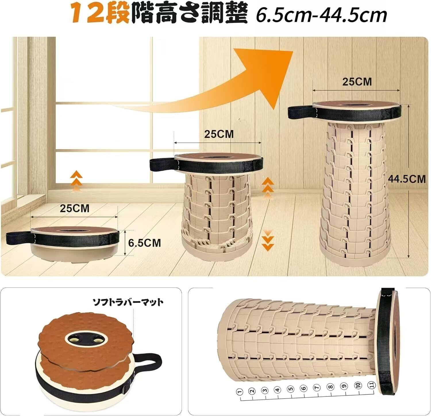 【使い方簡単、持ち運び便利】使い方簡単:少しひねりを入れながら両端を引くだけでスツールが完成。収納は逆方向に少しひねりを入れながら両端を押すだけで収納可能。また、ストラップ付きで、手に持ってでも、肩に掛けても、便利です。リュックにも収納可能です。